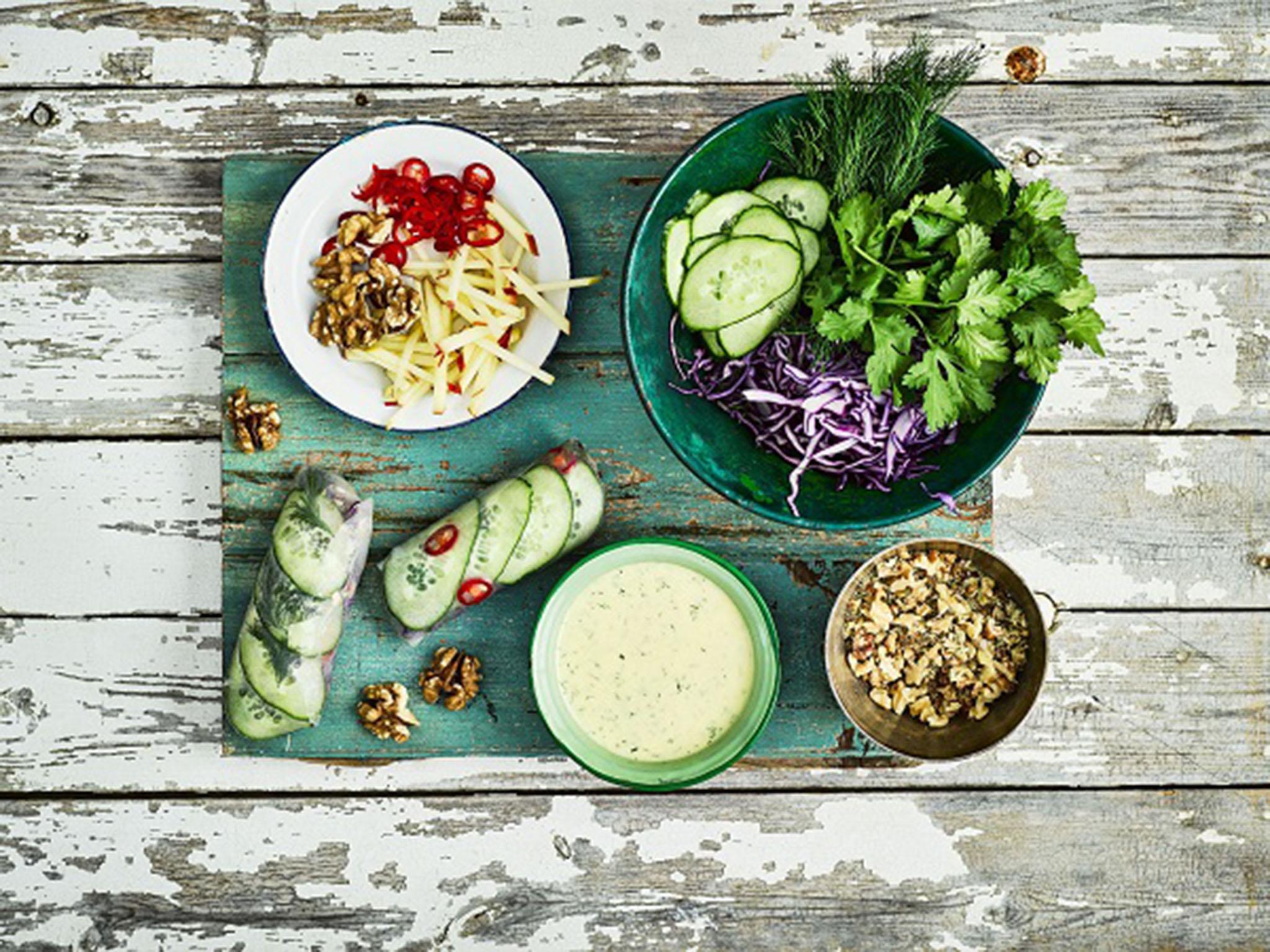 Top with a sprinkle of the herbs, chilli, apple and cabbage, finishing with a sprinkle of the walnut spice mix. Fold the edges of the wrapper in over the filling and roll up to seal the edge. Continue until you have used all the ingredients. Serve the wrappers with the dressing and any leftover walnut spice on the side to dip the rice paper rolls in as you go.