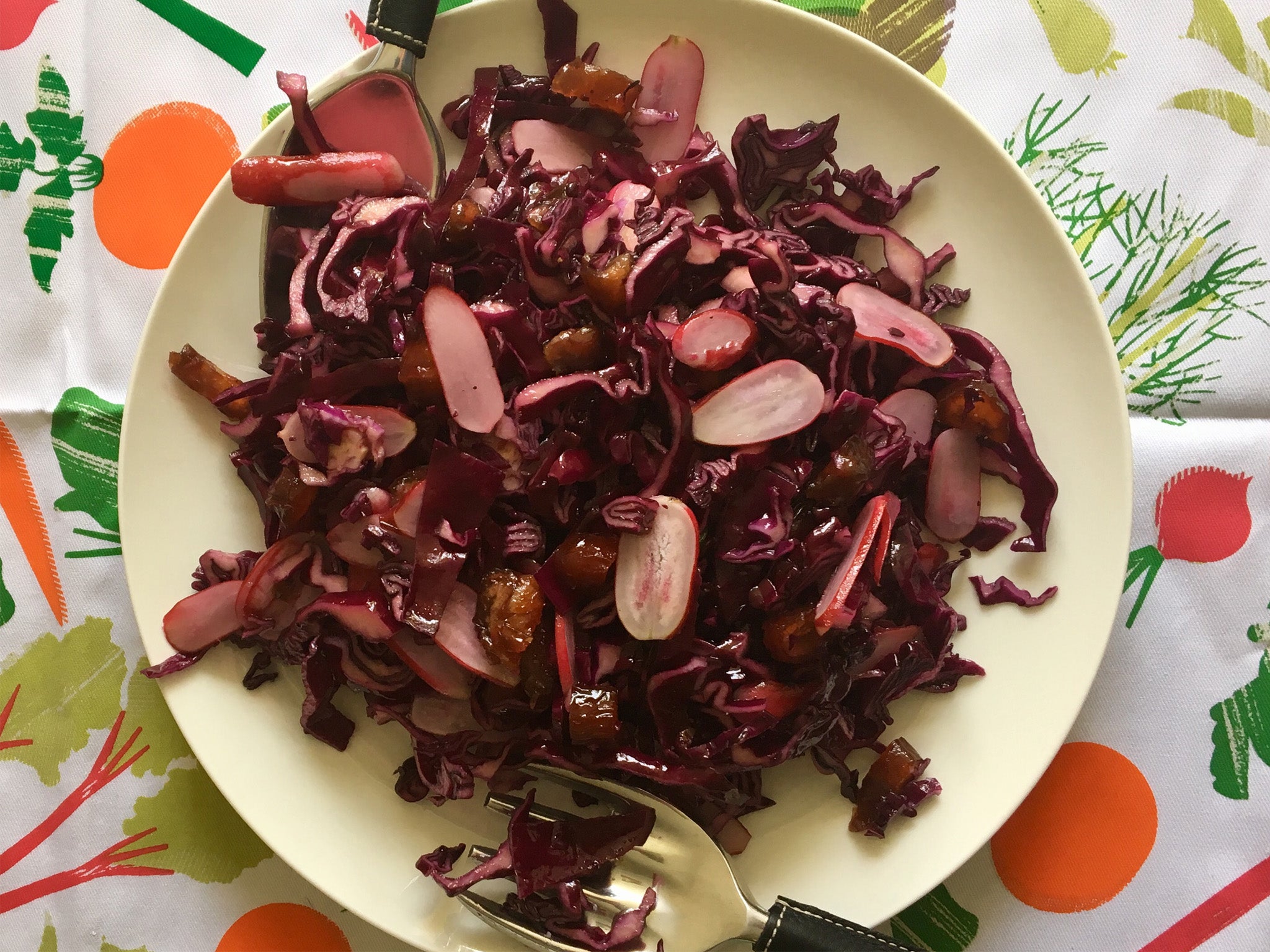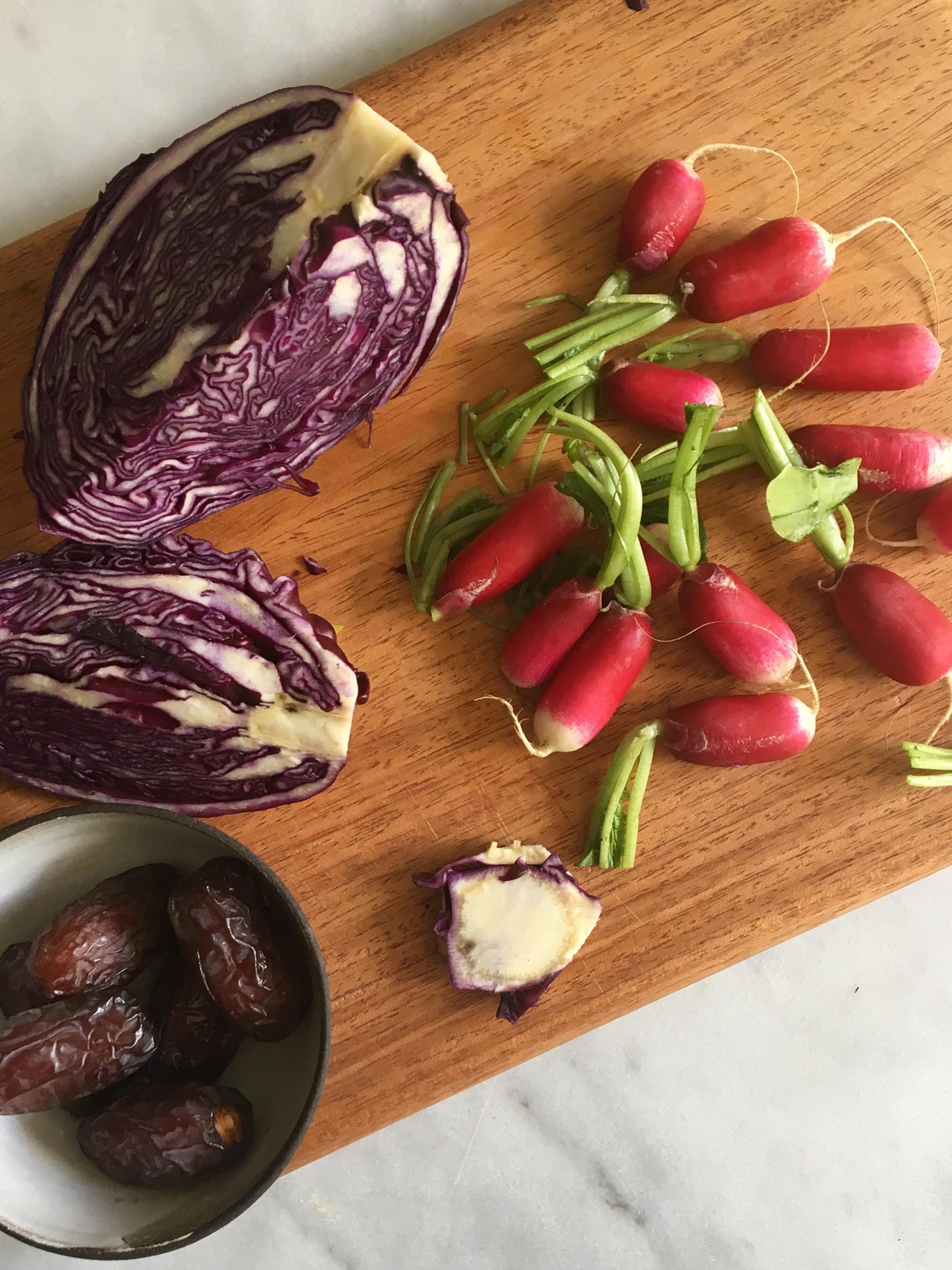 Red cabbage slaw with medjool dates and radishes