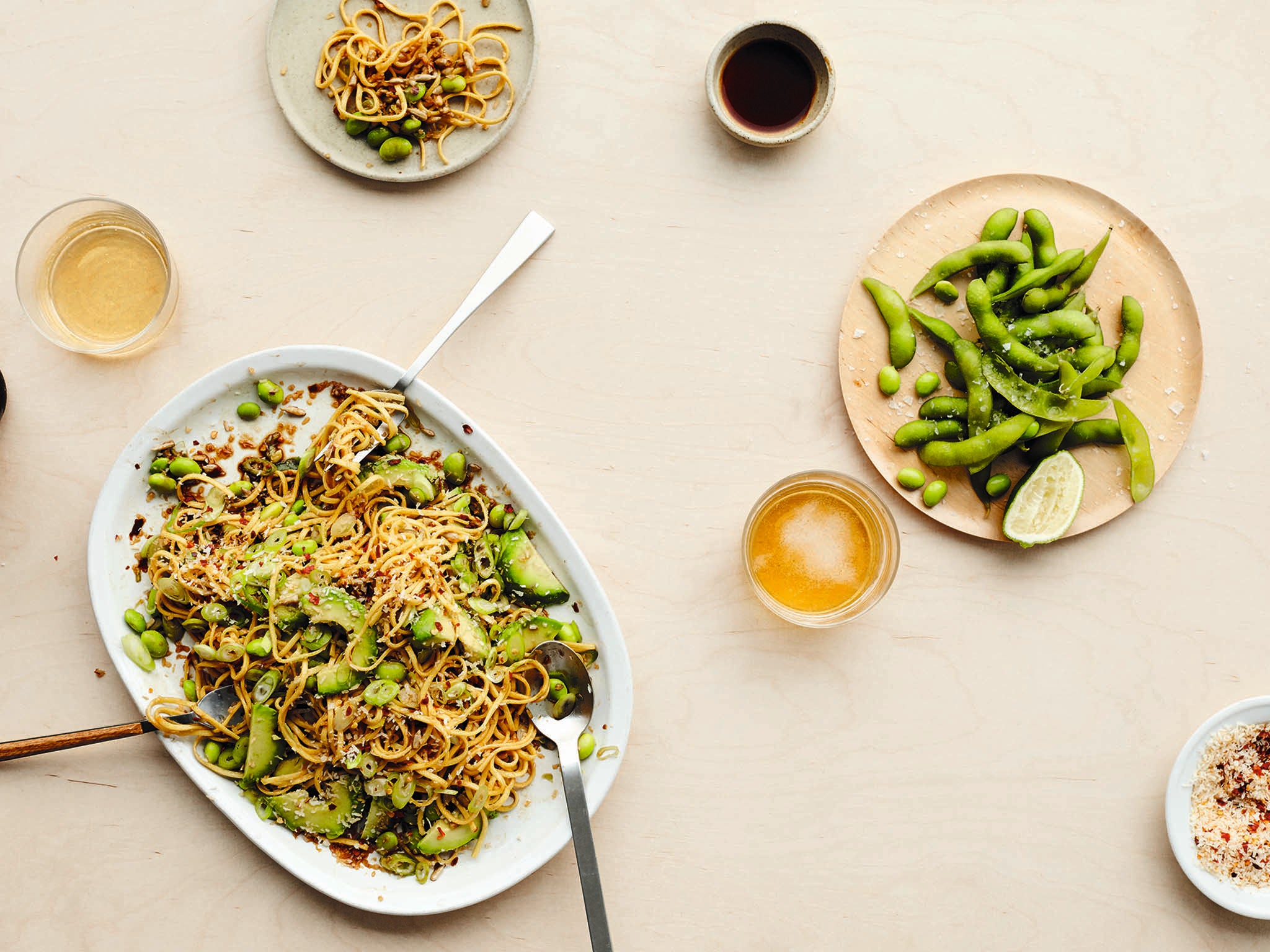 Avocado and coconut noodles with edamame beans, lime and ginger