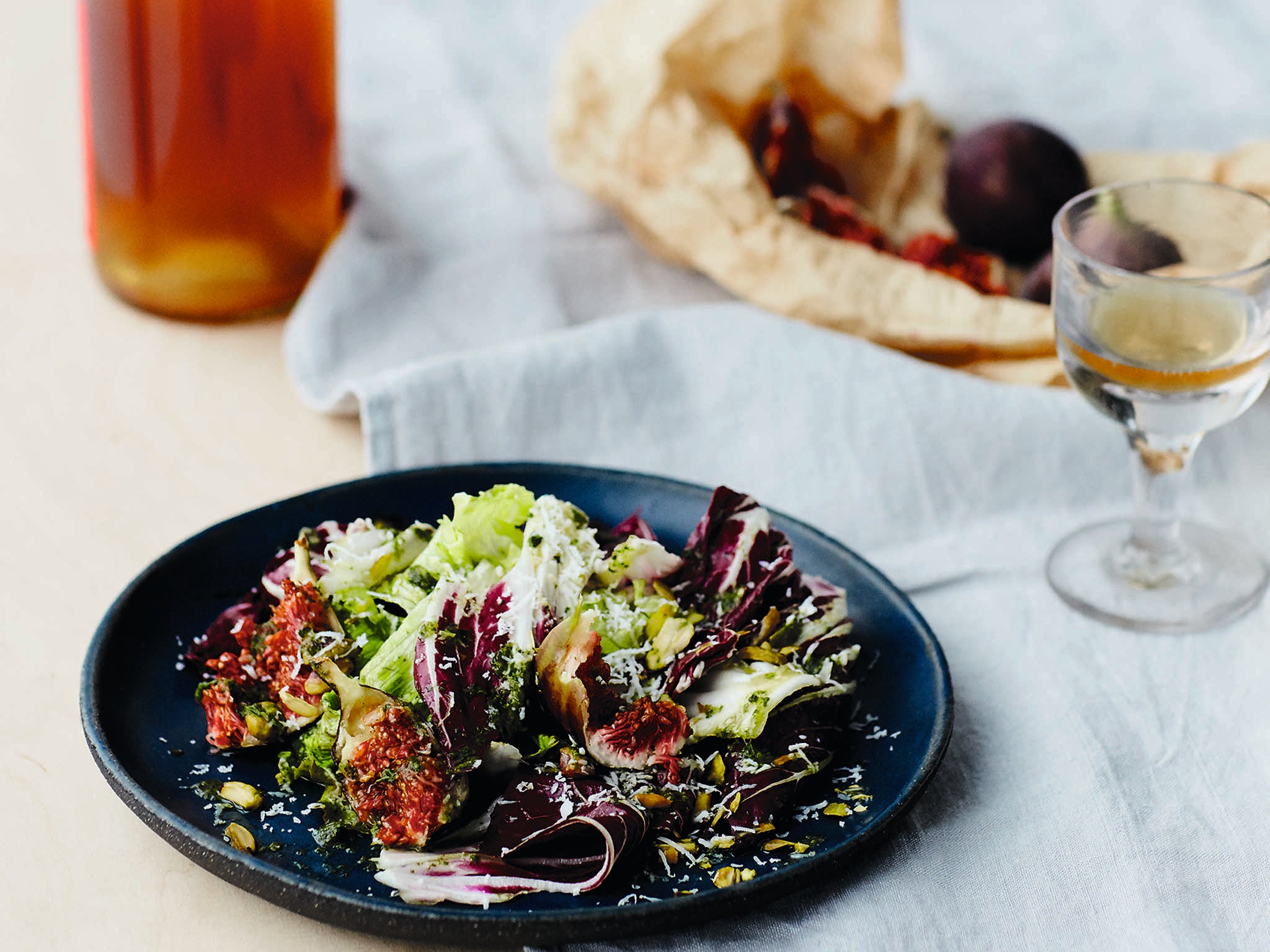 Fig, radicchio and halloumi with basil oil and pistachios