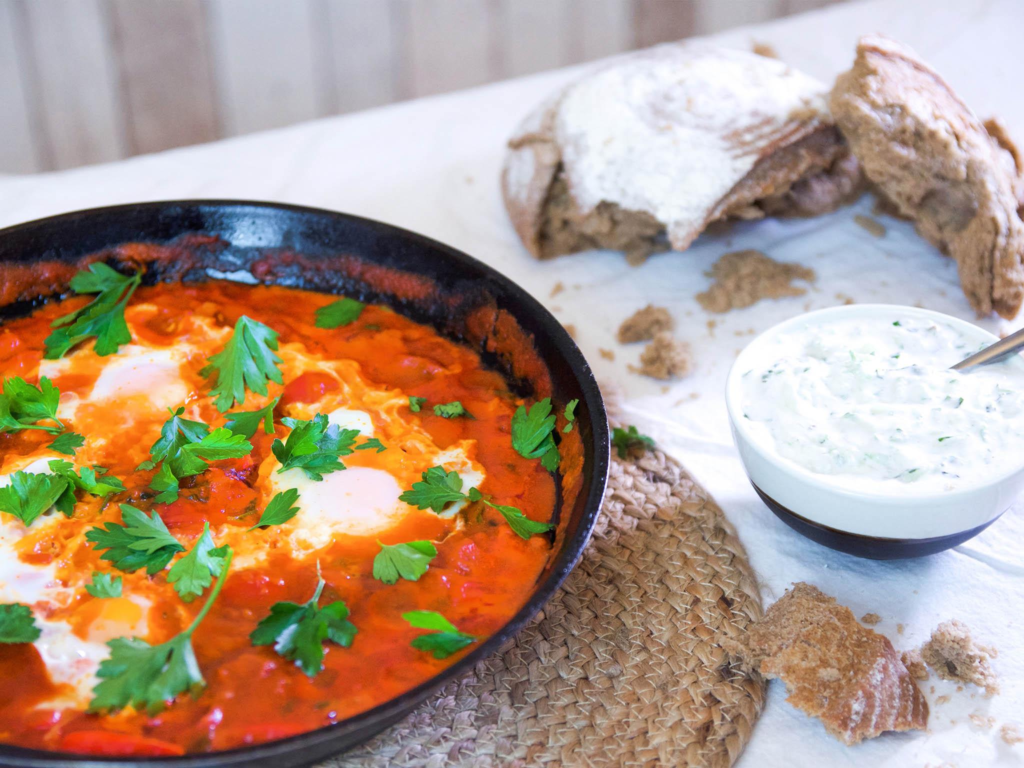 Stir through the CO YO, lemon juice and herbs, then season to taste. Next, make four to six small wells in the sauce. Break the eggs into a cup, one at a time, and gently add to the wells. Cook until the eggs are just set, but leaving the yolks runny. Serve with fresh herbs scattered over the top and dollops of the cucumber and lemon dip. Use the bread to mop up the sauce.