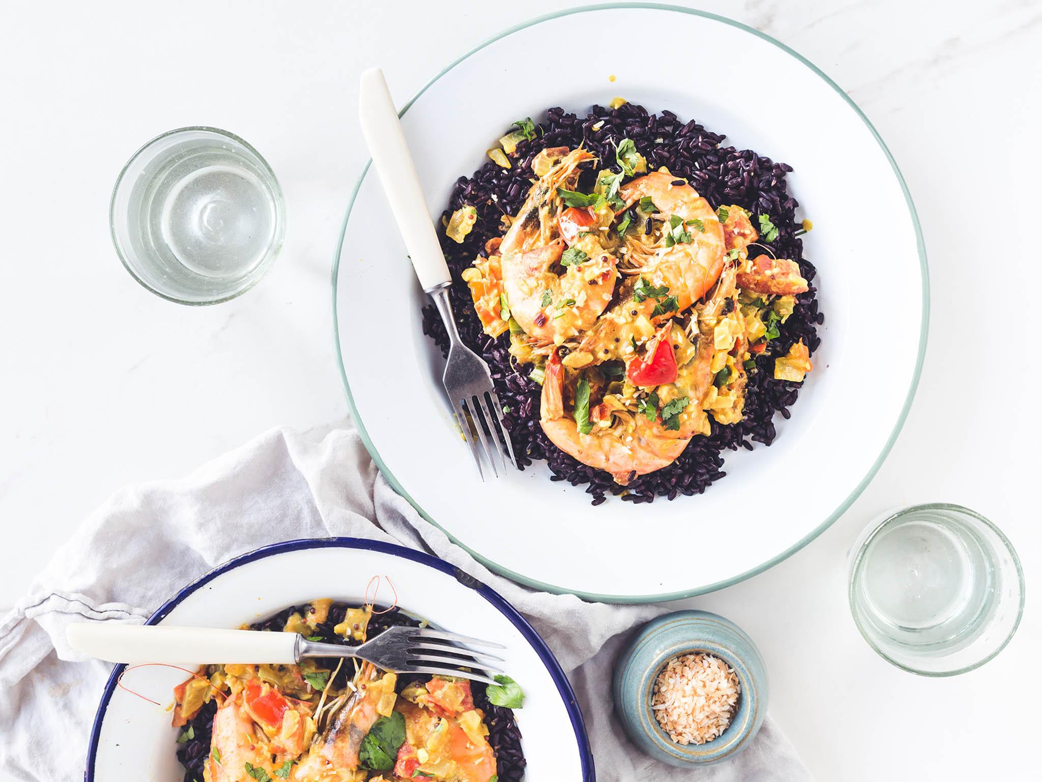 Serve the Sri Lankan coconut prawn curry in two warm bowls alongside the black rice.