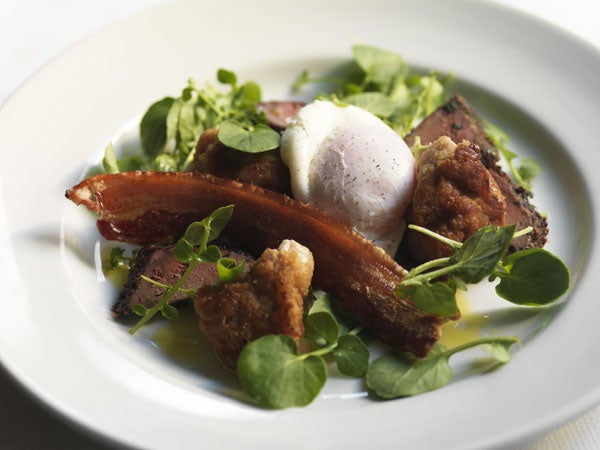 To serve, poach the eggs, arrange the winter salad leaves, offal and bacon on serving plates or in a bowl with the egg in the centre and spoon over the dressing.