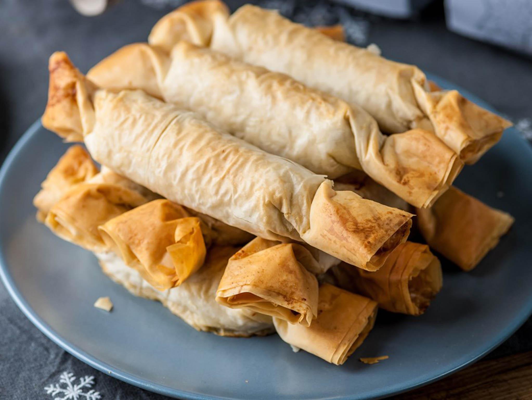 Lay a sheet of filo pastry on a work surface. Brush half of the sheet with butter and fold over to create a double-layered square. Repeat with the remaining filo to make 8 double-layered squares. Divide the mix into 8 portions and shape each portion into a cylinder.