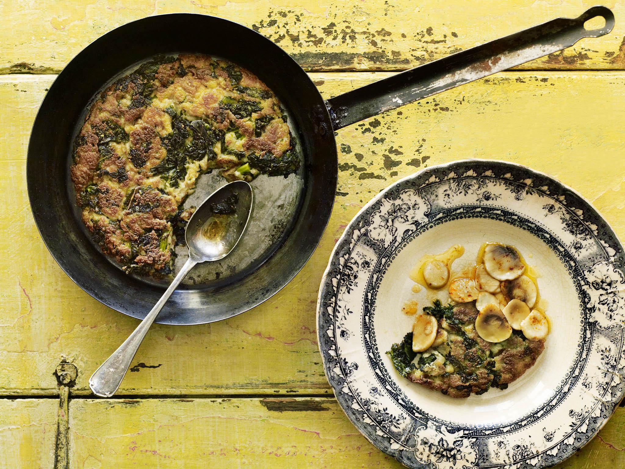 Migas is traditionally made from bread soaked in milk which is then gently toasted in animal fat with lots of garlic and seasonal greens. The idea of eating soaked and fried bread may seem strange, but migas is fantastic. The bread base is a blank canvas that can take on other flavours – here I’ve used kale, coriander and garlic and added marinated mushrooms.