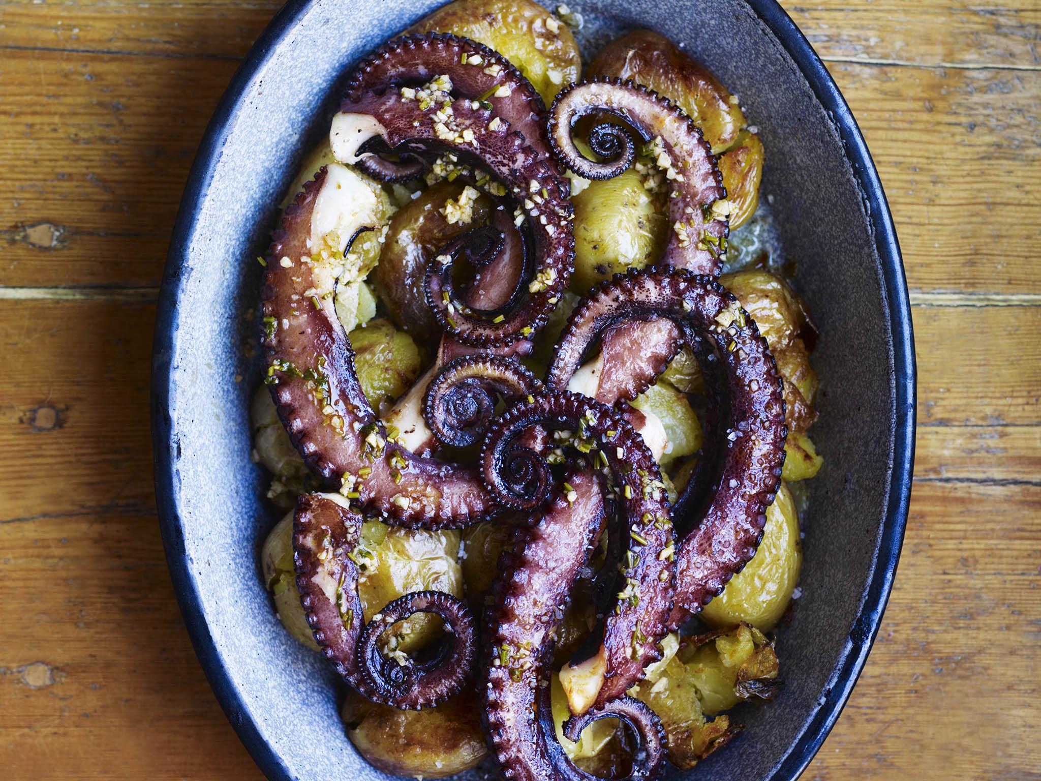 To make the smashed potatoes, preheat the oven to 210C/gan 190C/gas 6½. Cook the potatoes in plenty of salted boiling water until just tender but not breaking up. Remove from the pan, drain well and leave until cool enough to handle. Murro means “punch” in Portuguese, and we are now going to punch the potatoes. Smash each one gently with the palm of your hand. Toss them in a bowl with the olive oil, bay leaves and garlic and season with salt and pepper. Put them in a large baking dish (big enough to hold the octopus too) and bake for 30 minutes, or until golden brown and crispy.
