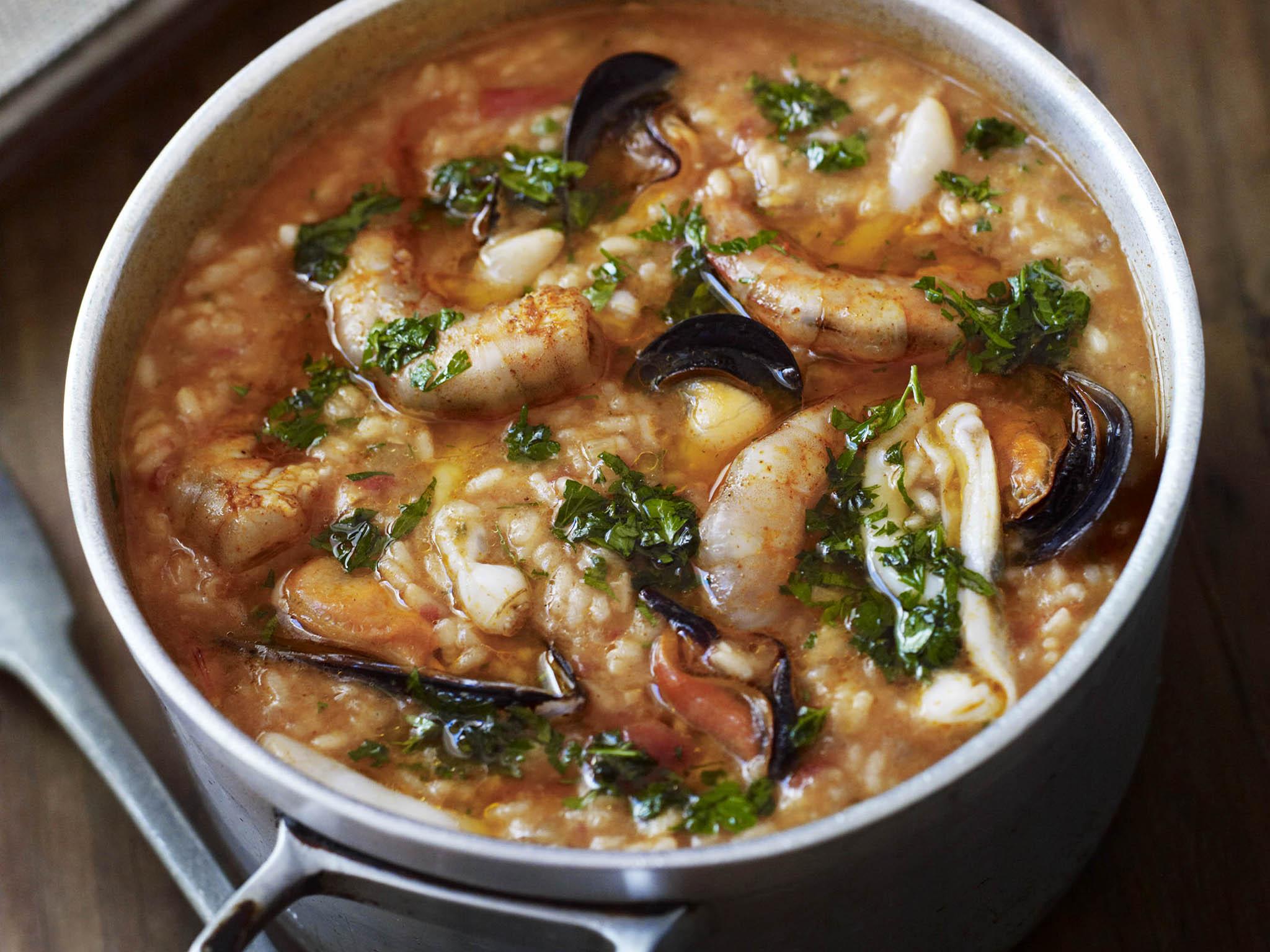 In the greatest versions of arroz de marisco, rice is cooked in a stock made from the shells and trimmings of as many as ten different types of shellfish, and then the tender morsels of seafood are added at the end. Typically, tomatoes, onions and coriander are the other elements that make up this fantastic recipe, and the flavours come together perfectly. It’s a great dish to put in the middle of the table and let everyone dig in. If you’d like it less spicy, deseed the chilli.
