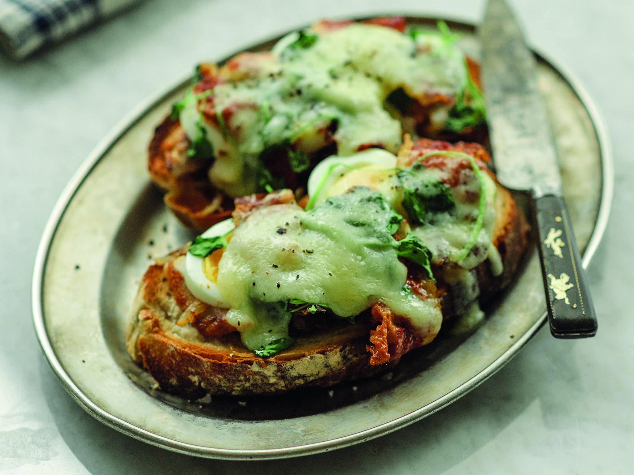 Toast the sourdough slices on both sides under the grill, then lightly butter each. Do not turn off the grill. Spread the pieces of toast with the onion compote and add the egg slices. Top with the partridge breasts, crispy pancetta, watercress and finally the cheese. Place the toasties under the grill until the cheese melts, then lightly season with salt and cracked pepper.