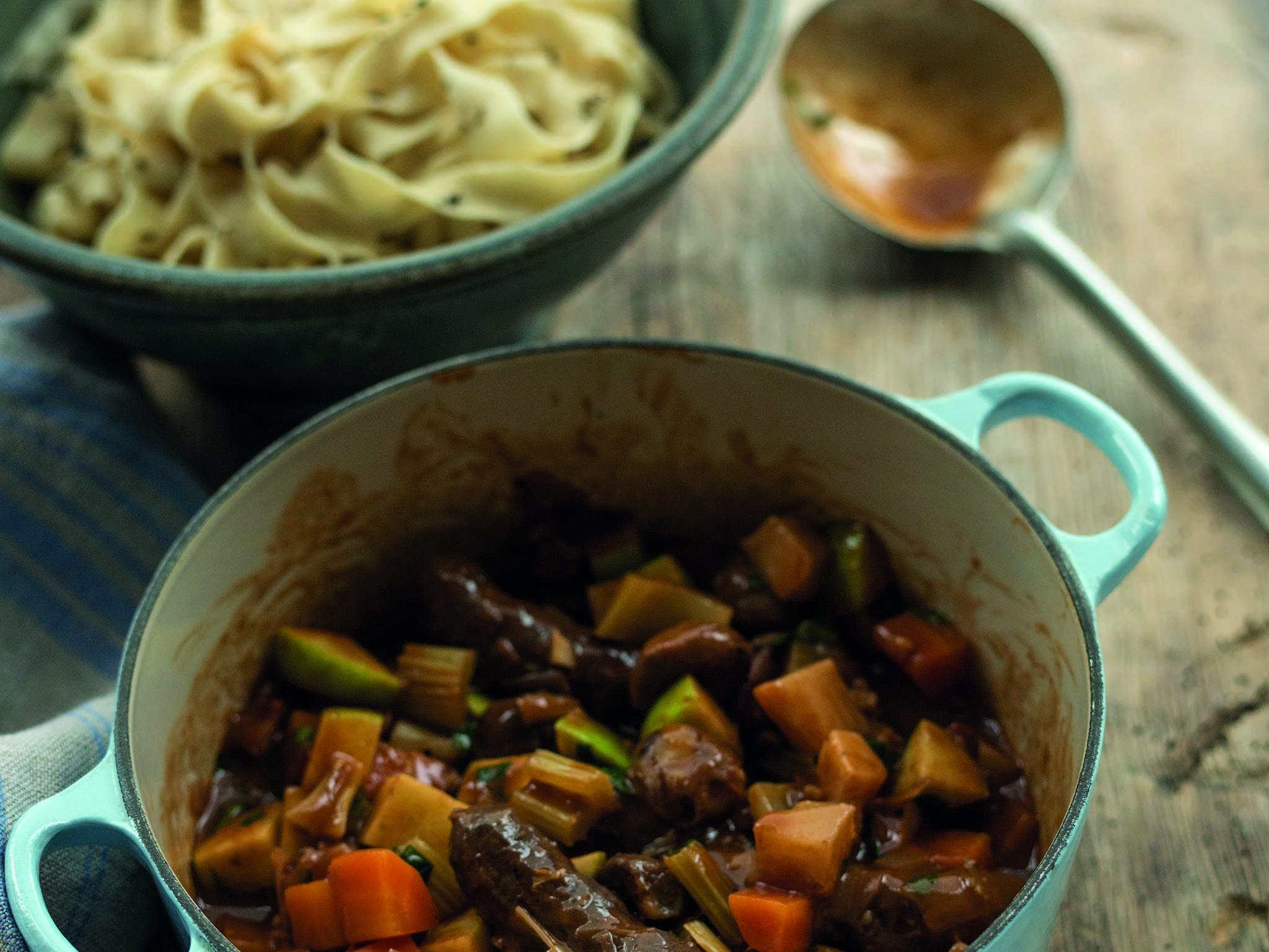 This recipe is a bit of a family favourite. To my mind, it is a perfect mid-week supper, so when you have a bit of spare time make and freeze a batch, ready for a rainy day. I always enjoy cooking this dish with lovely root vegetables and apple, as the combination is unbeatable with the venison sausages. I also often serve this with a bowl of tagliatelle.