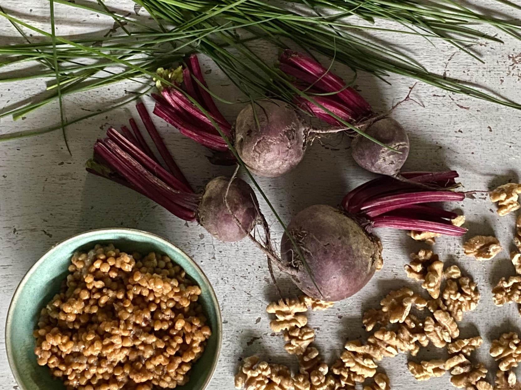 Remove from the oven and when cool enough to handle, remove the outer skin. To plate, place the lentils on a serving plate, top with the beetroot and walnuts and generously drizzle over the chive oil.
