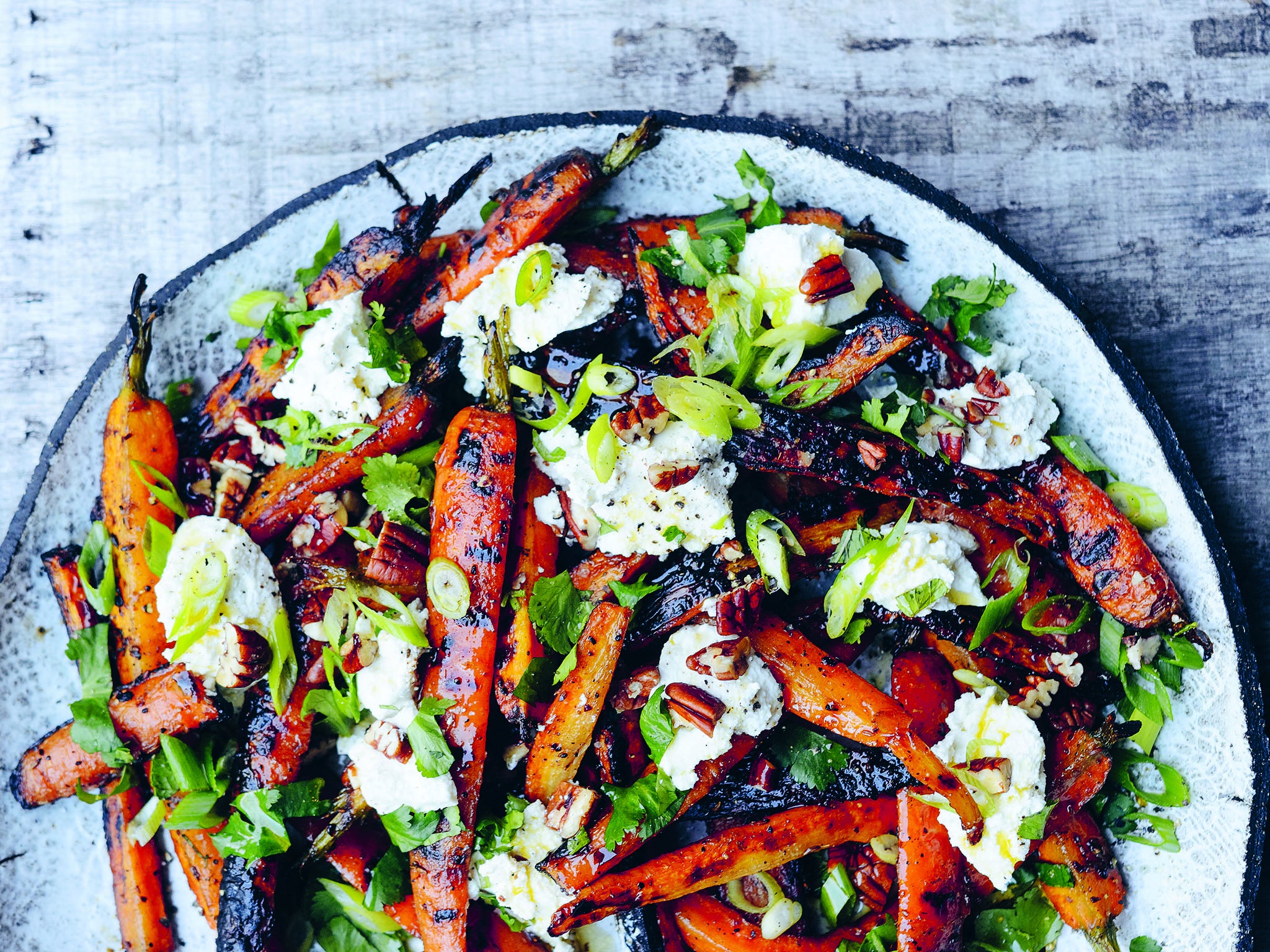 Once soft and caramelised, scatter the carrots over a serving plate and dot with heaped teaspoons of ricotta. Sprinkle over the spring onions, chopped pecans and coriander. Finally, add a generous drizzle of olive oil and finish with a good grind of pepper. Serve while still warm.