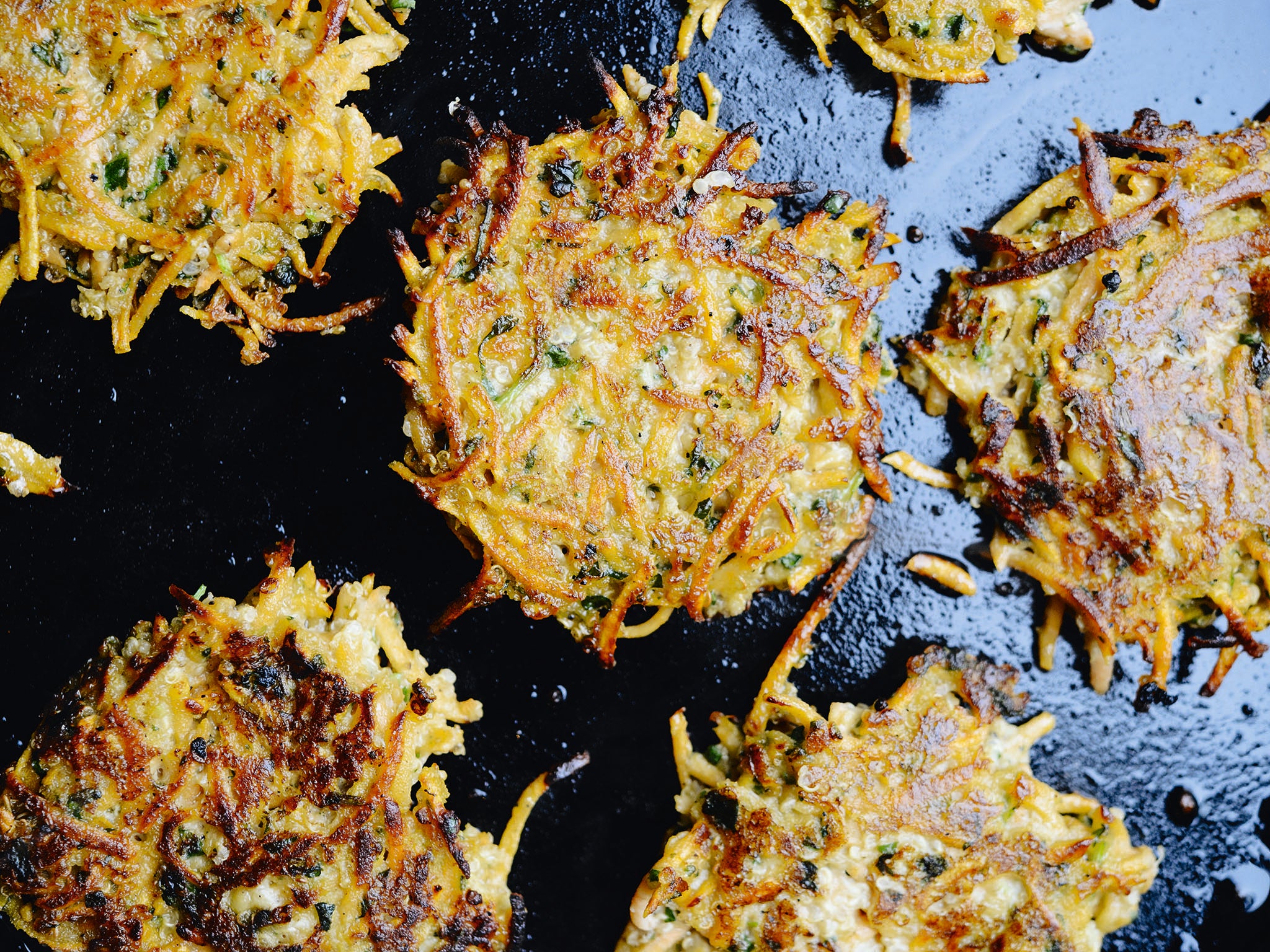 Sweet potato has a lot less starch than regular potato, so these fritters are delicate little blighters. The flour helps to bind them together, but you will still get little straggly bits around the edges. Just don’t scrimp on the oil when frying – crispy edges are surely the main point of a rosti!