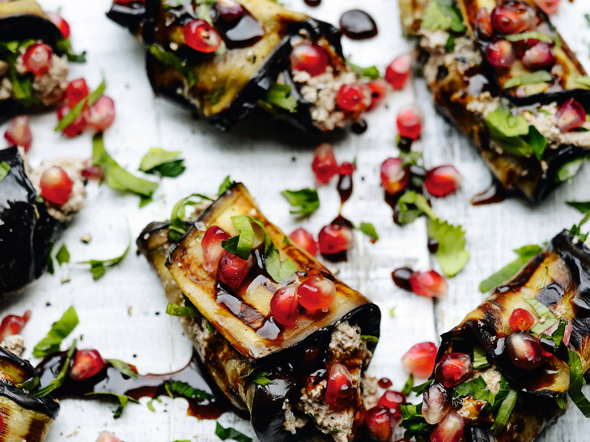 Once all the aubergines are cooked, spread each slice with a thin layer of walnut paste. Sprinkle over most of the pomegranate seeds and herbs, reserving a little of both to garnish. Roll up each slice and arrange on a large platter. Sprinkle over the rest of the pomegranate seeds and herbs and finish with a generous drizzle of pomegranate molasses.