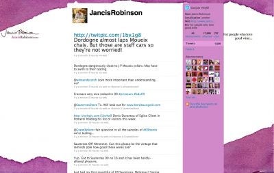 Jancis Robinson, the first female to receive a Master of Wine, renowned British author who is oftenreferred to as the "Queen of Wine," has been tweeting her thoughts on Sauternes 2009 during En Primeur Bordeaux week, annual wine futures event.