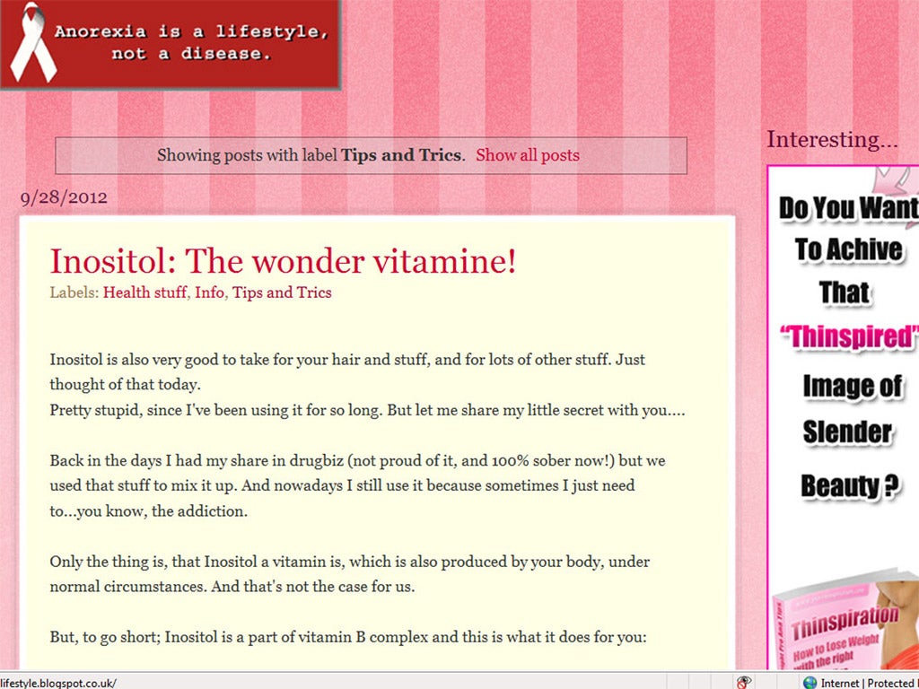 “It starts with an individual who wants to share their experience and as they get a following they set themselves up as almost Goddess-like,” she said. “When I started this research last January I came across a website set up by a girl who was disgusted with herself because she had put on a few pounds at Christmas. She planned to fast for three days and regain control.