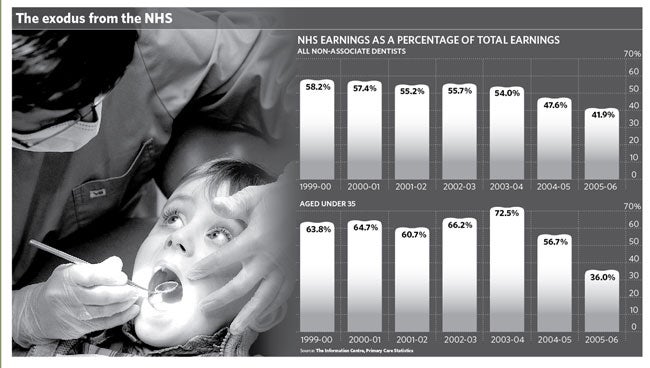 Dentists earned 58.2 per cent of their income from the NHS in 1999-2000 but that fell to 41.9 per cent in 2005-06. Among those under 35, the proportion of earnings from the NHS fell from 63.8 per cent to 36 per cent in the same period, a decline of more than a quarter in six years.