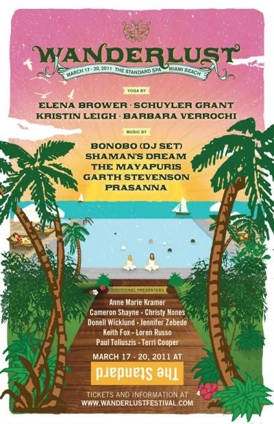 Wanderlust, with three US events in 2011, aims to provide stiff competition to the plethora of music festivals for yogi-loving crowds. The Miami Beach event, while smaller in scale than Wanderlust's signature California event, offers classes, workshops, talks, and music concerts at the Standard Spa and Resort.