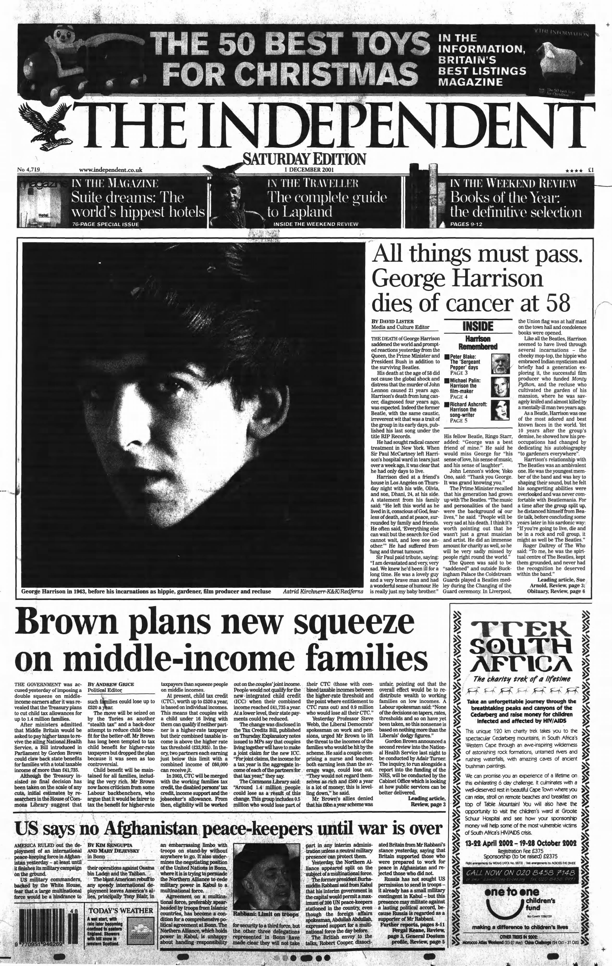 George Harrison dies at the age of 58, prompting tributes from across the world of music and public life. The Independent reflects on his legacy as a Beatle and songwriter, noting messages of remembrance from fellow bandmates and even the Queen, who said she was “saddened” to hear of his passing.