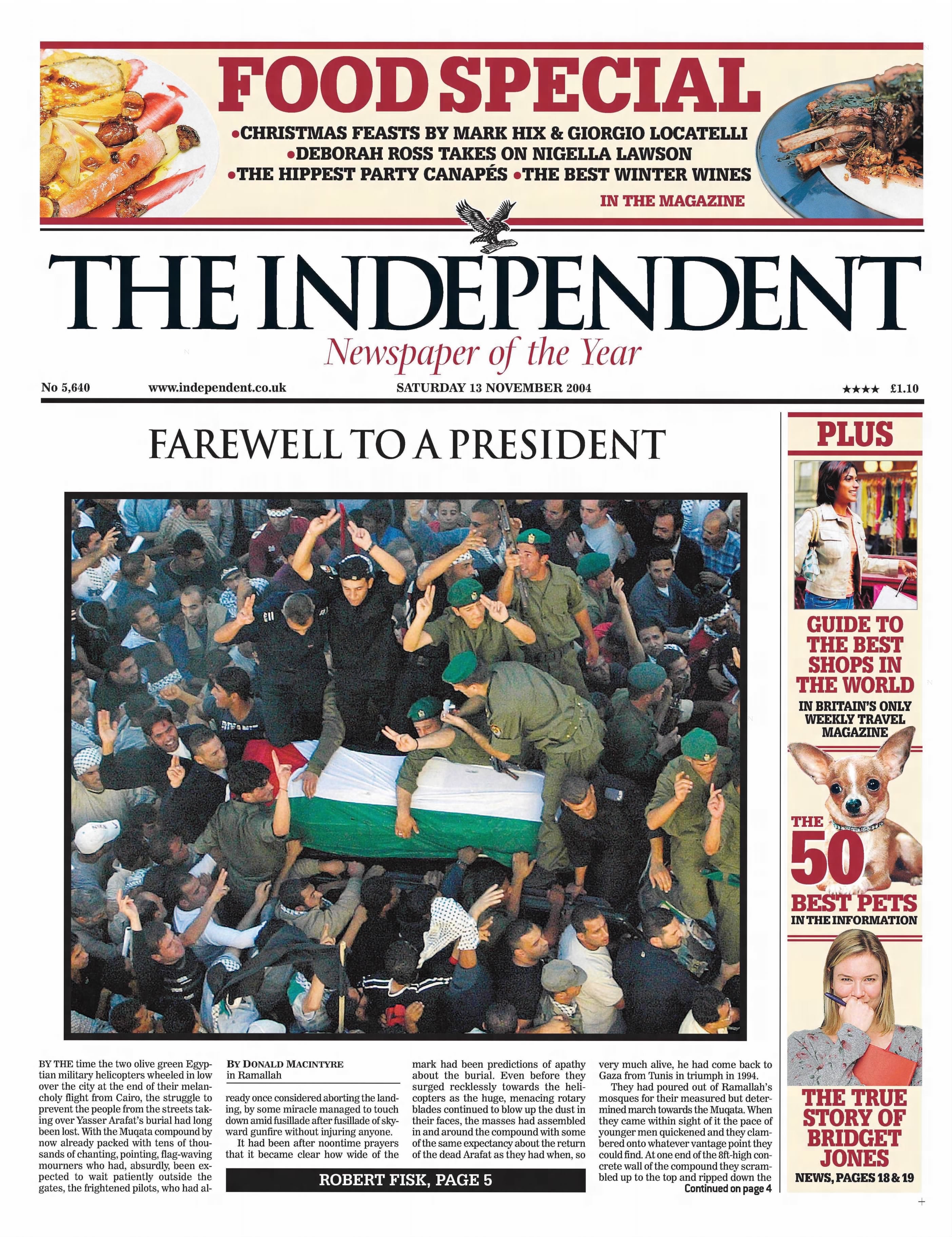 The Independent reports crowds pouring into the streets of Ramallah following the death of Yasser Arafat in Paris. His passing leaves the Palestinian national movement without its defining figurehead, creating a leadership vacuum and deep uncertainty over the future path to statehood.