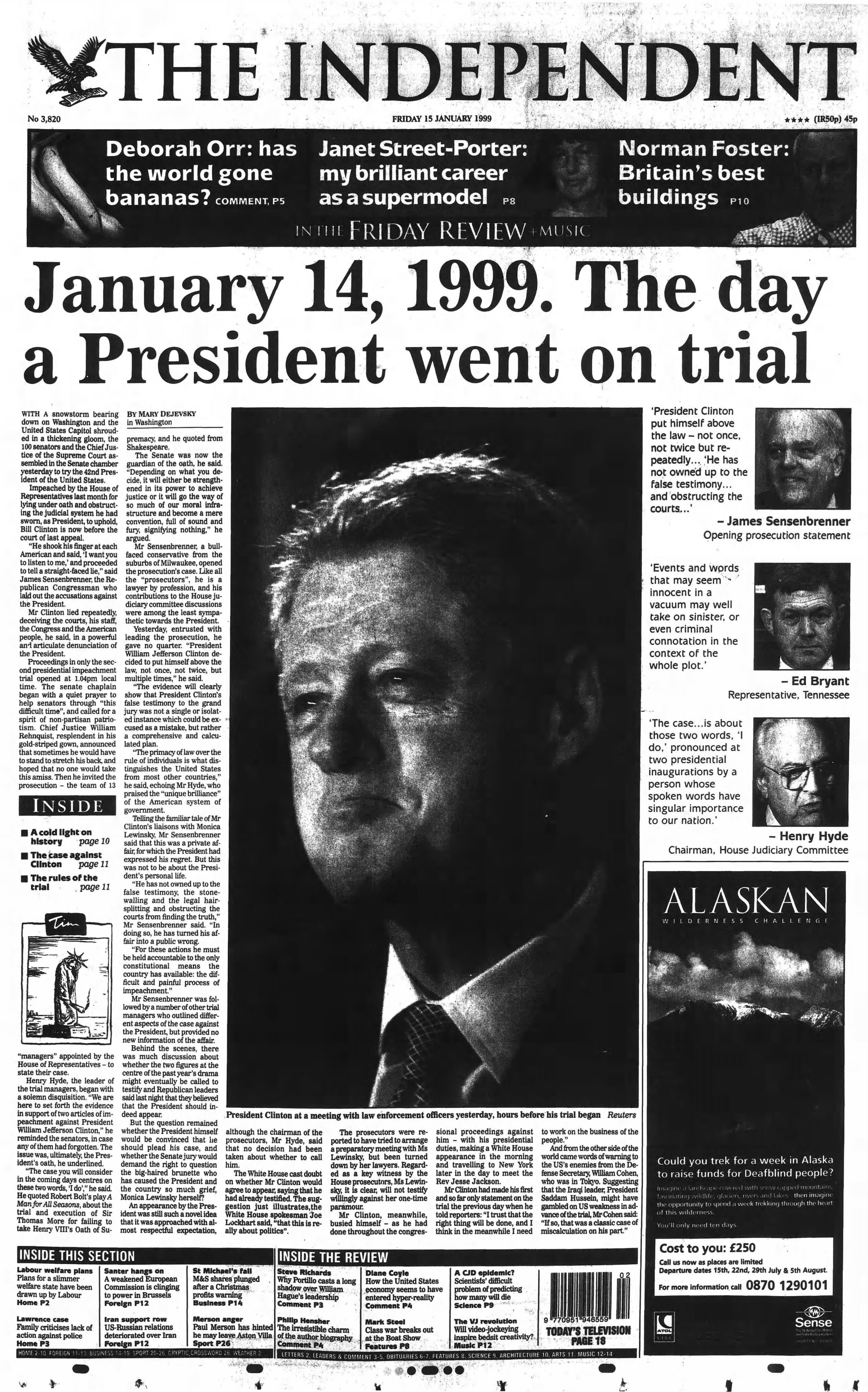 “The day a President went on trial,” reports The Independent. As Washington is gripped by a snowstorm, President Bill Clinton battles a storm of his own as impeachment proceedings begin in the US Senate. All 100 senators, alongside the Chief Justice of the Supreme Court, assemble in the chamber following Clinton’s impeachment the previous month. The trial ends in February 1999 with Clinton acquitted on both charges, allowing him to remain in office.