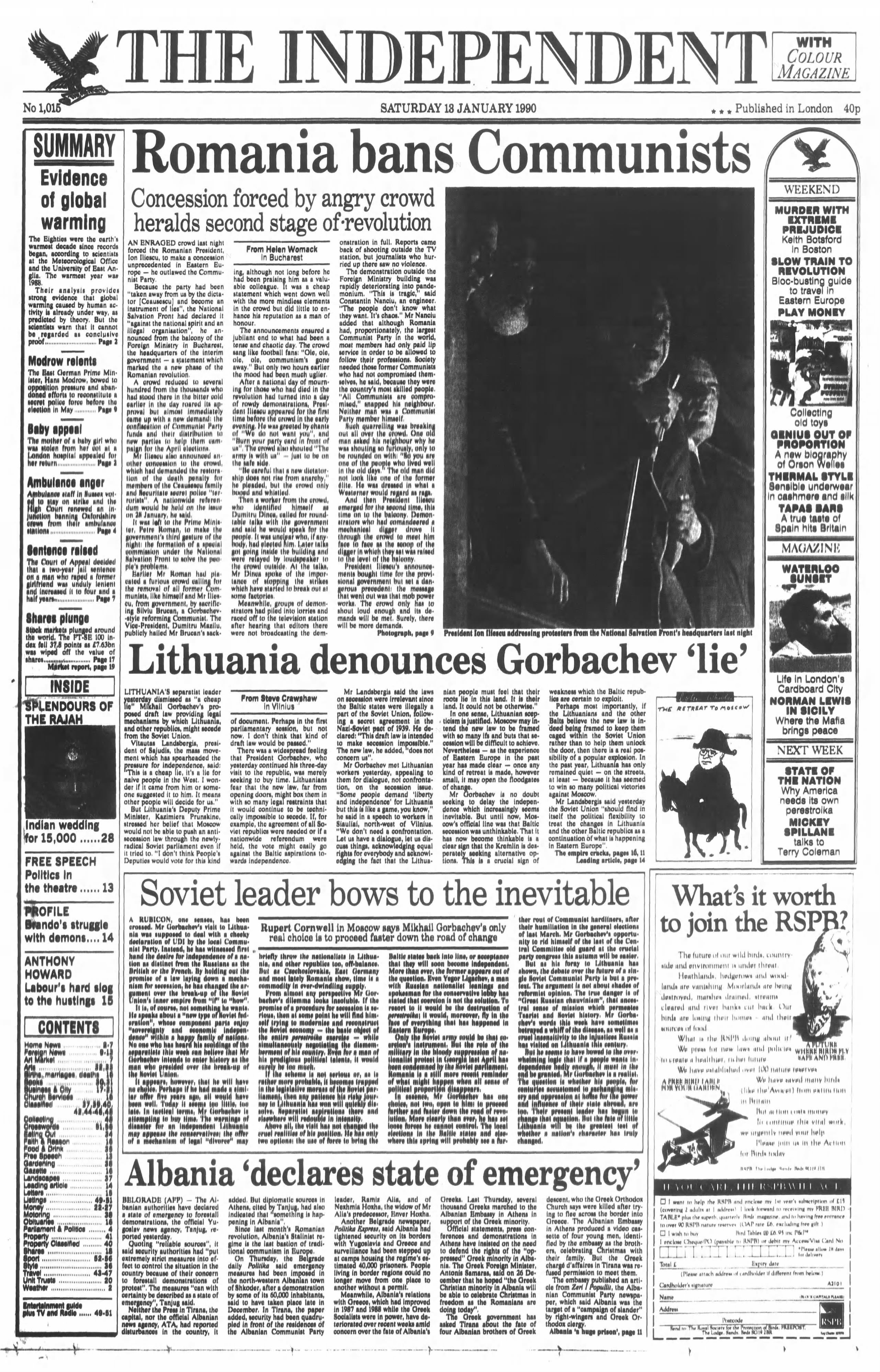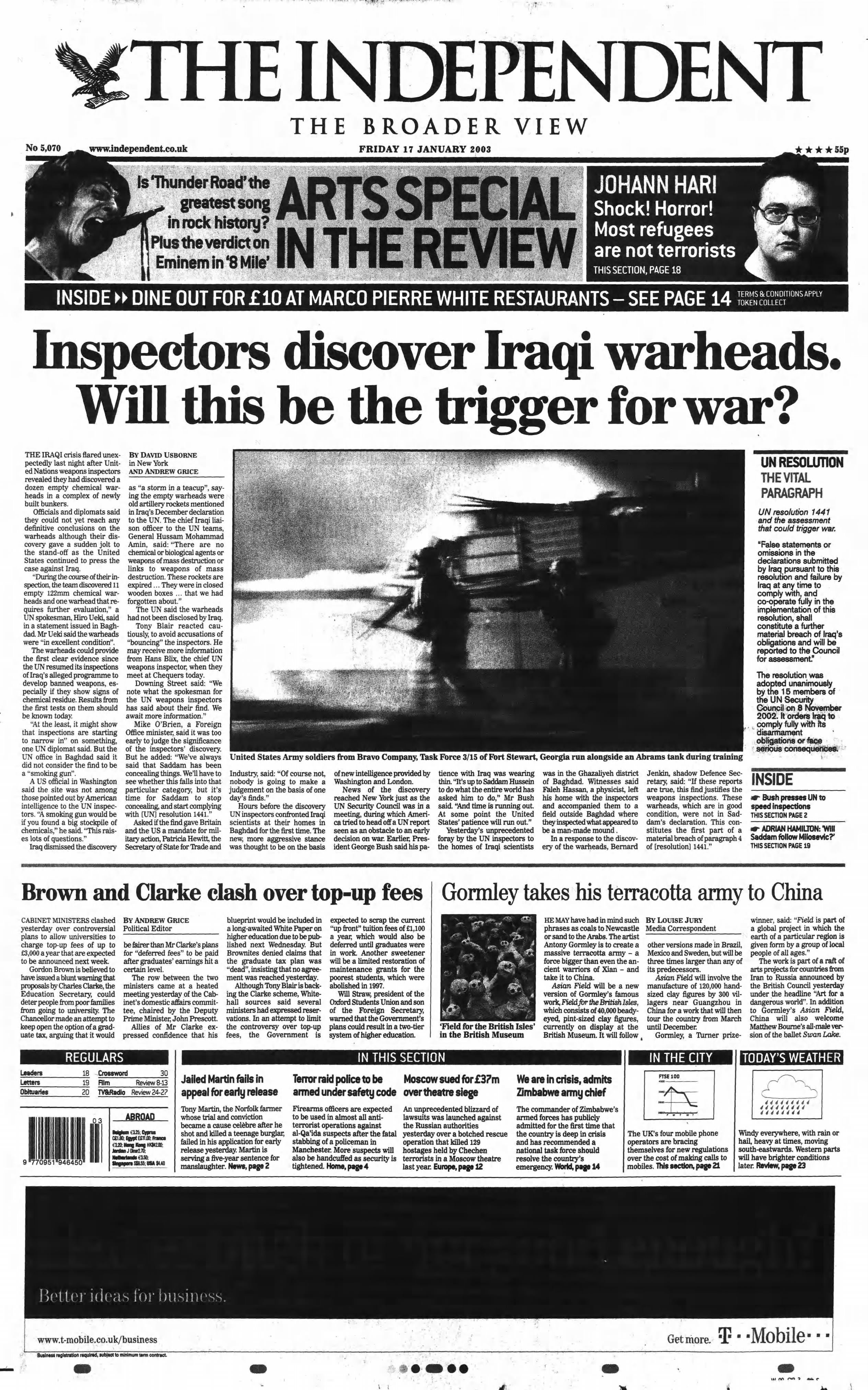 The world loses its Starman as tributes pour in following the death of David Bowie. The news continues to look star-ward as the Cassini spacecraft reaches Saturn after a seven-year, two-billion-mile journey, marking a landmark moment in space exploration. Drama unfolds closer to home when a passenger jet makes a crash-landing on the Hudson River, with all 155 people on board surviving in what later becomes known as the “Miracle on the Hudson”. In geopolitics, Romania bans the Communist Party and Moscow moves to recognise Lithuania’s independence as the Soviet Union continues to unravel. Meanwhile, the West edges closer to conflict in the Middle East after UN weapons inspectors discover Iraqi warheads. Within months, a US-led invasion is under way. All are revealed on the front pages of The Independent.