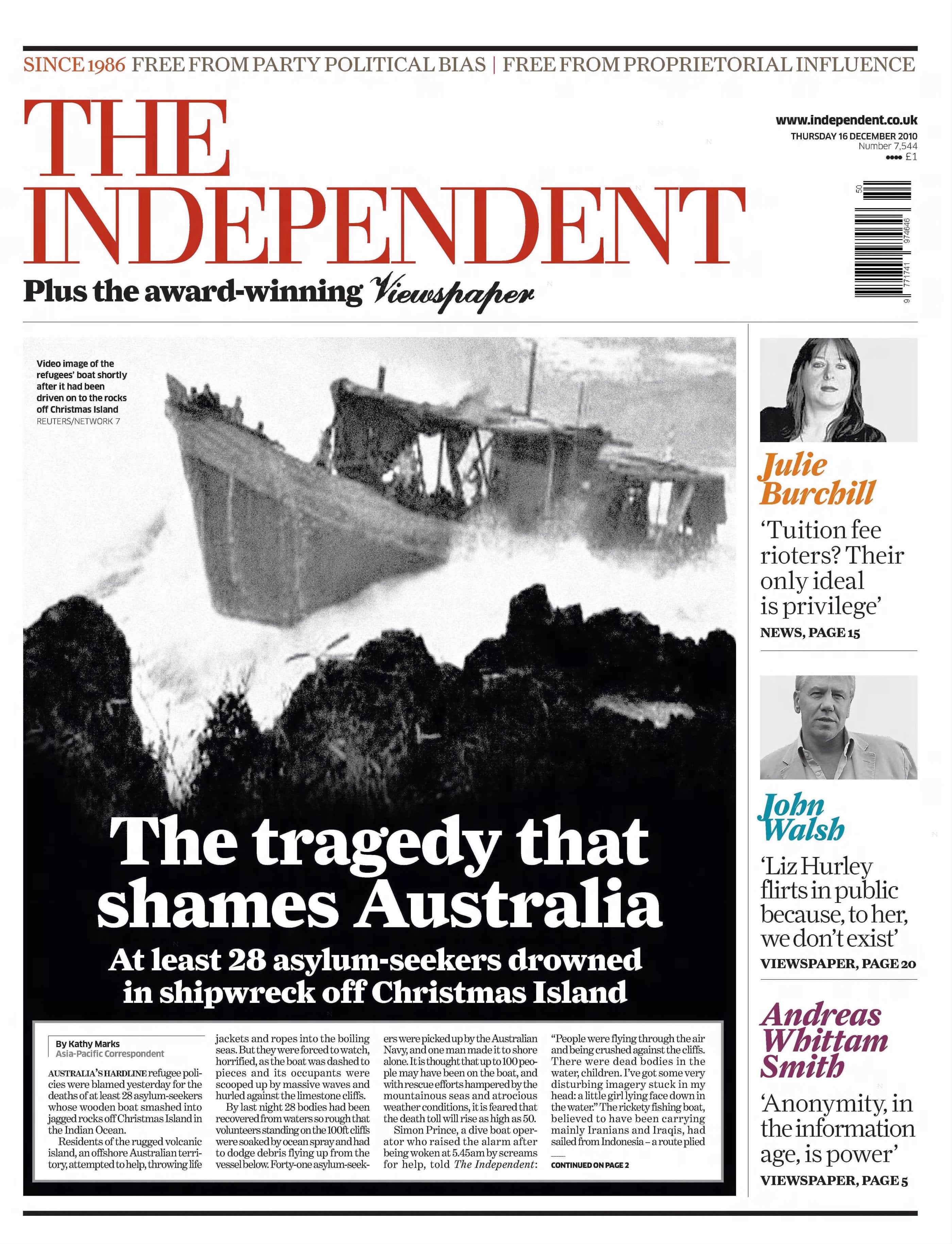 At least 28 asylum seekers drown after their boat smashes into rocks off Australia’s Christmas Island. The Independent reports how residents watched helplessly as the vessel was torn apart by heavy seas, amid growing criticism of Australia’s hardline refugee policies and the perilous routes taken by those seeking asylum.