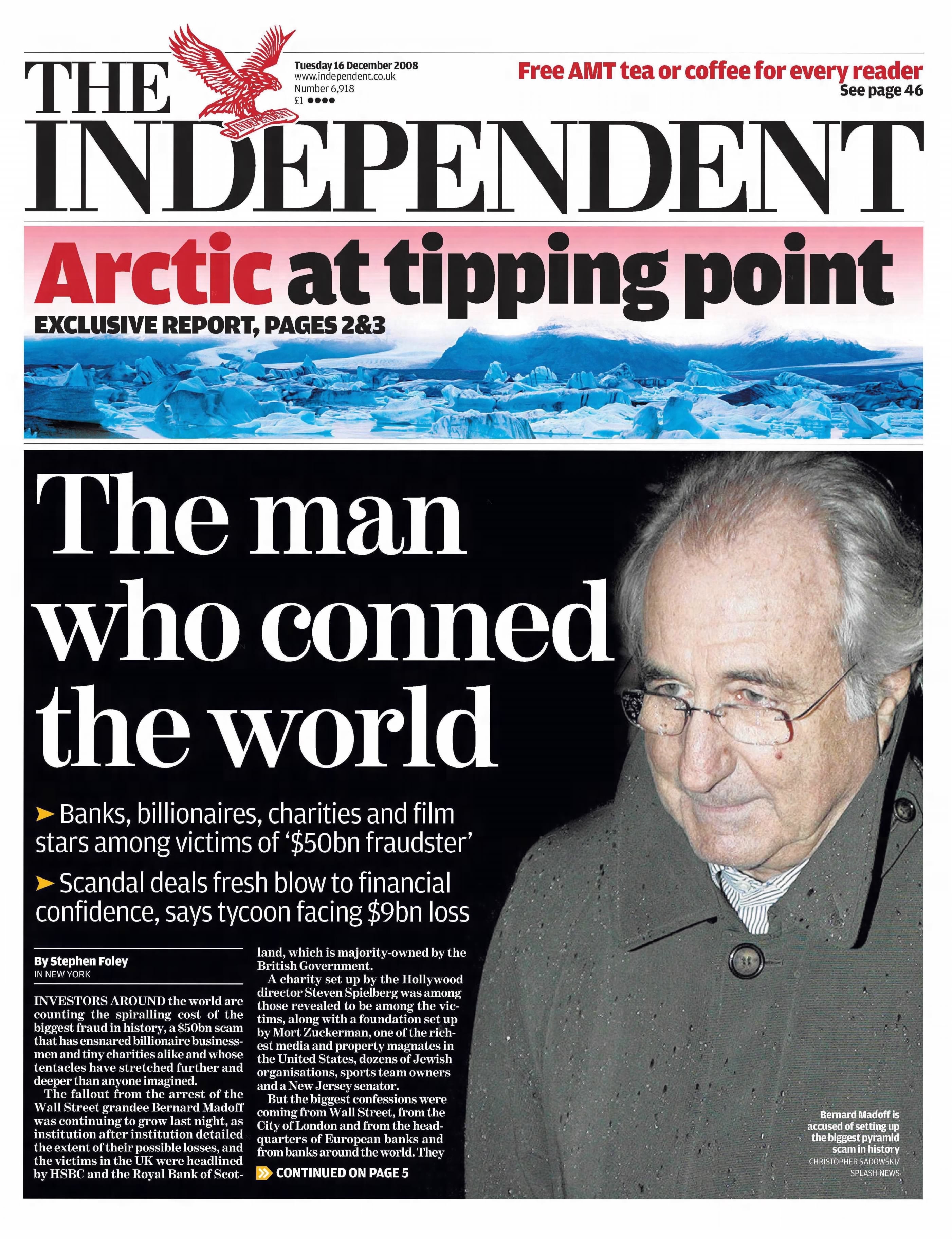 Bernard Madoff is arrested, revealing a vast Ponzi scheme with losses estimated at tens of billions of dollars. The Independent reports the fallout spreading across banks, charities and high-profile investors, as the scandal deepens the crisis of trust gripping Wall Street.