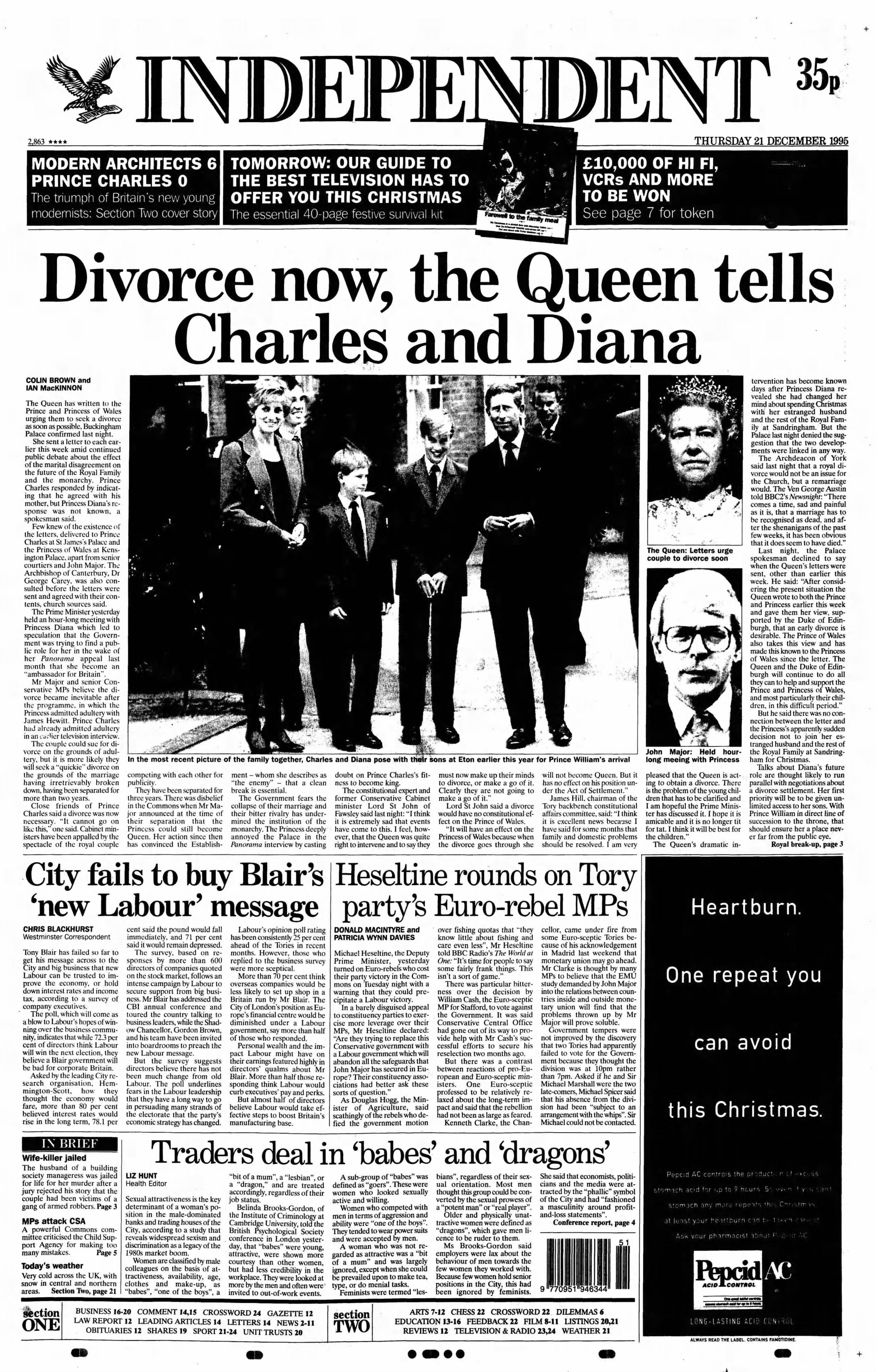 The Queen urges the Prince and Princess of Wales to divorce, writing to both as public debate intensifies over the impact of their separation on the future of the monarchy. The Independent reports that Prince Charles agrees with the decision, while Princess Diana’s response remains unclear. The couple would formally divorce the following year, after four years of separation.