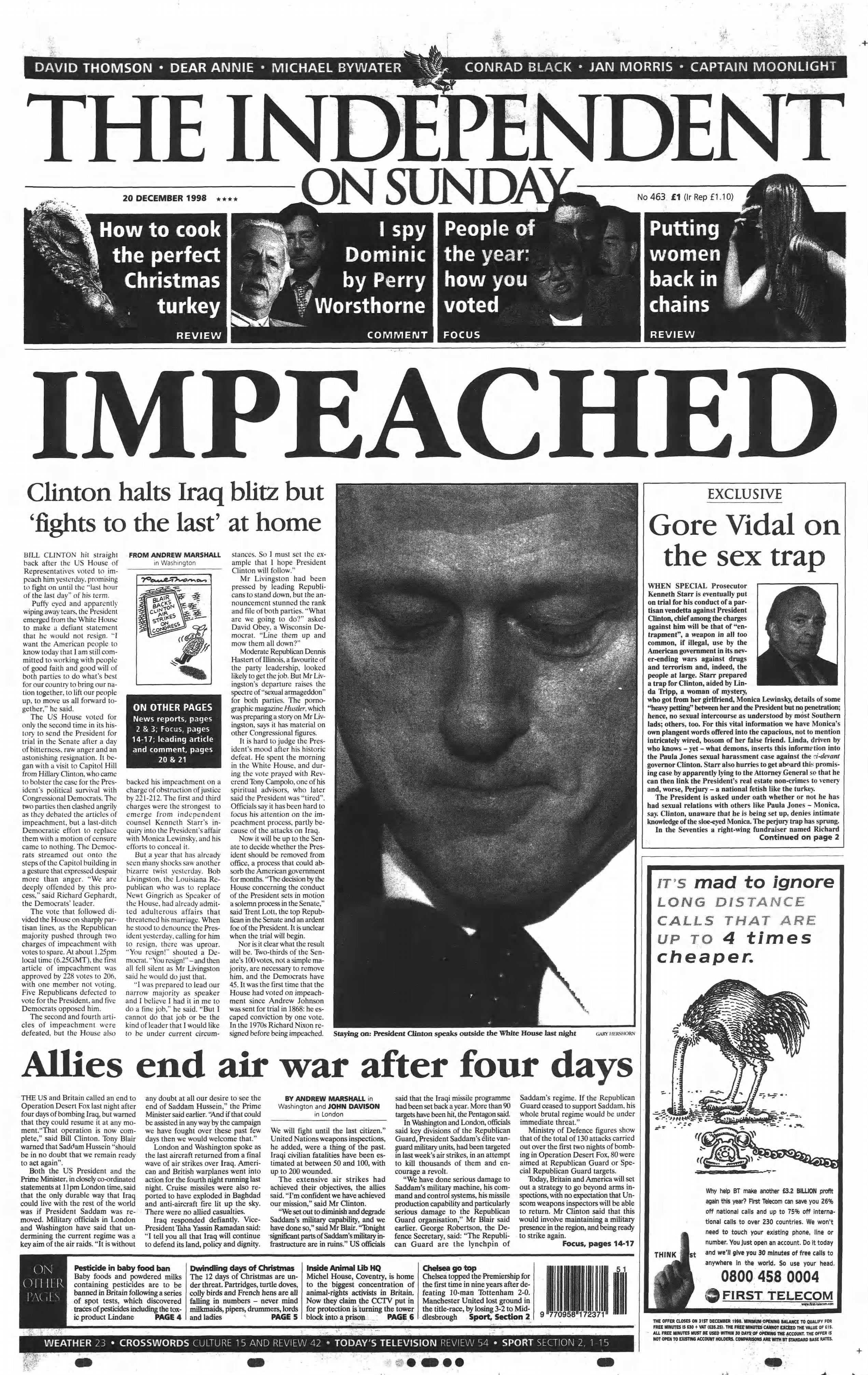 President Bill Clinton is impeached – only the second time in American history a president is sent for trial in the Senate. The charges stem from an inquiry into his relationship with Monica Lewinsky and alleged efforts to conceal it. Clinton vows to remain in office, declaring he will fight on until “the last hour of the last day” of his term.