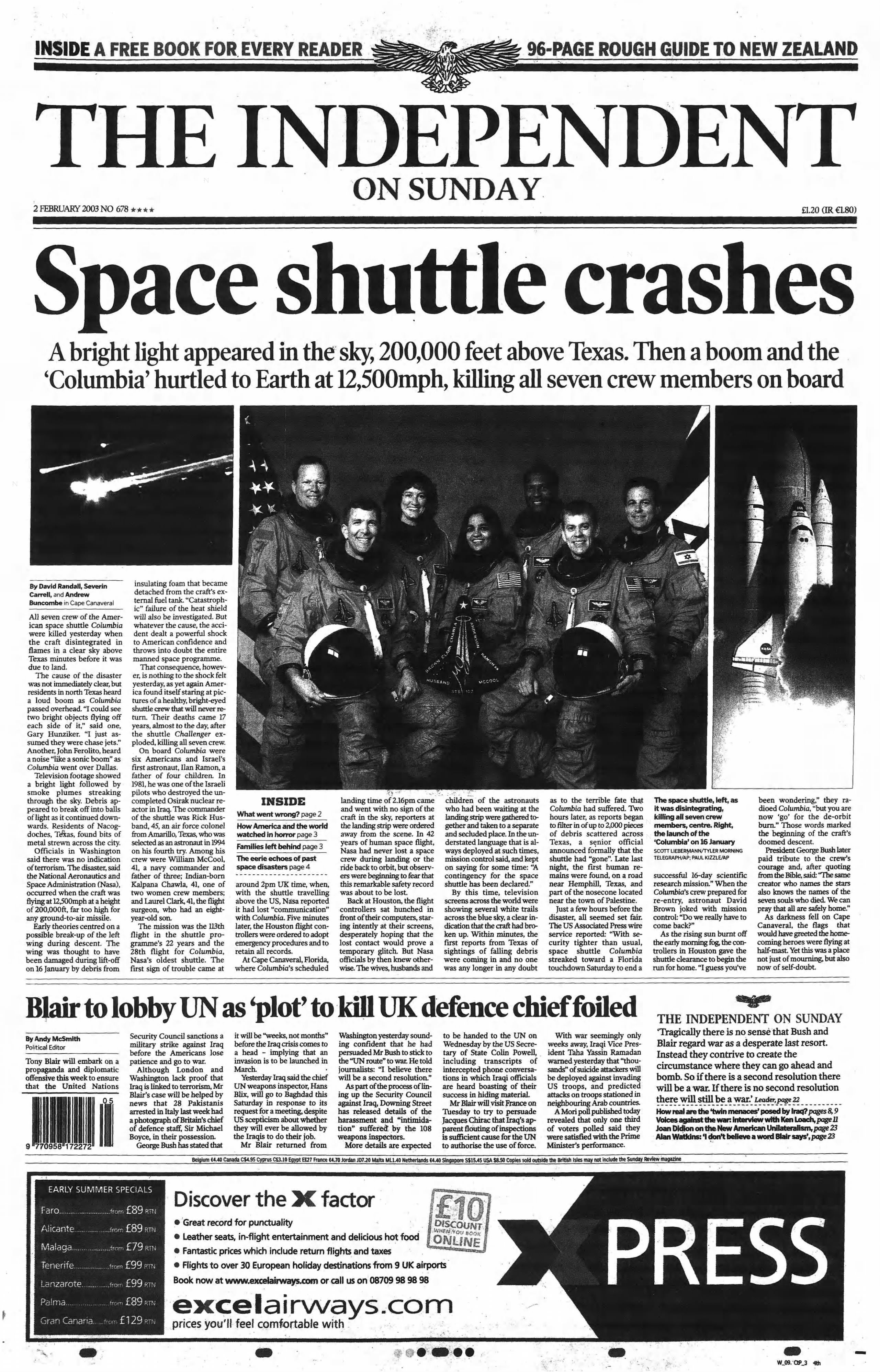 The space shuttle Columbia breaks apart during re-entry over the United States, killing all seven astronauts on board and bringing a mission that began 16 days earlier to a devastating end. Nasa confirms the loss of contact shortly before the scheduled landing, as debris is scattered across several states. The disaster prompts the grounding of the shuttle fleet and a major investigation, which later concludes that damage to the shuttle’s heat shield during launch led to the catastrophe.