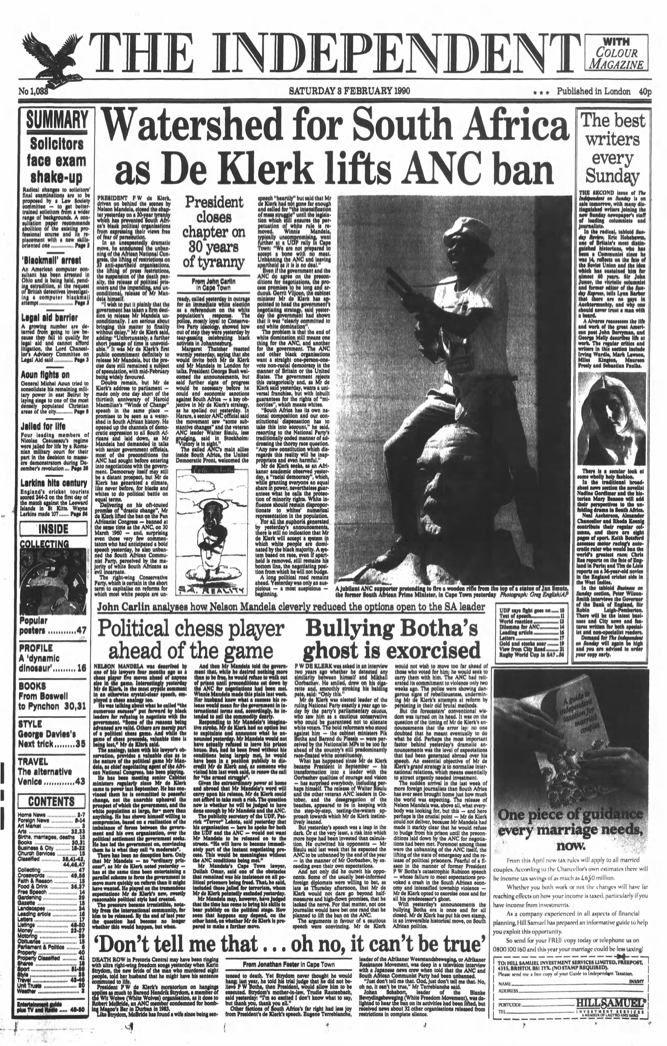 Welcome to a week of political transformation, as guaranteed communist rule comes to an end in the Soviet Union and a watershed moment in South Africa sees the ban on the African National Congress lifted, alongside a promise of Nelson Mandela’s unconditional release. In the United Kingdom, parliament votes to legalise same-sex marriage after an impassioned debate, marking a decisive shift in the country’s approach to equal rights. Elsewhere, struggles over freedom and expression play out on the streets of Cairo during the Arab spring, and in print as Salman Rushdie mounts a public defence of his novel in the face of the fatwa issued against him. And in a galaxy far, far away (20,000 light years to be precise), a red supergiant star explodes, captured in dazzling detail by the Hubble Space Telescope. All this, and more, is revealed on the front pages of The Independent.