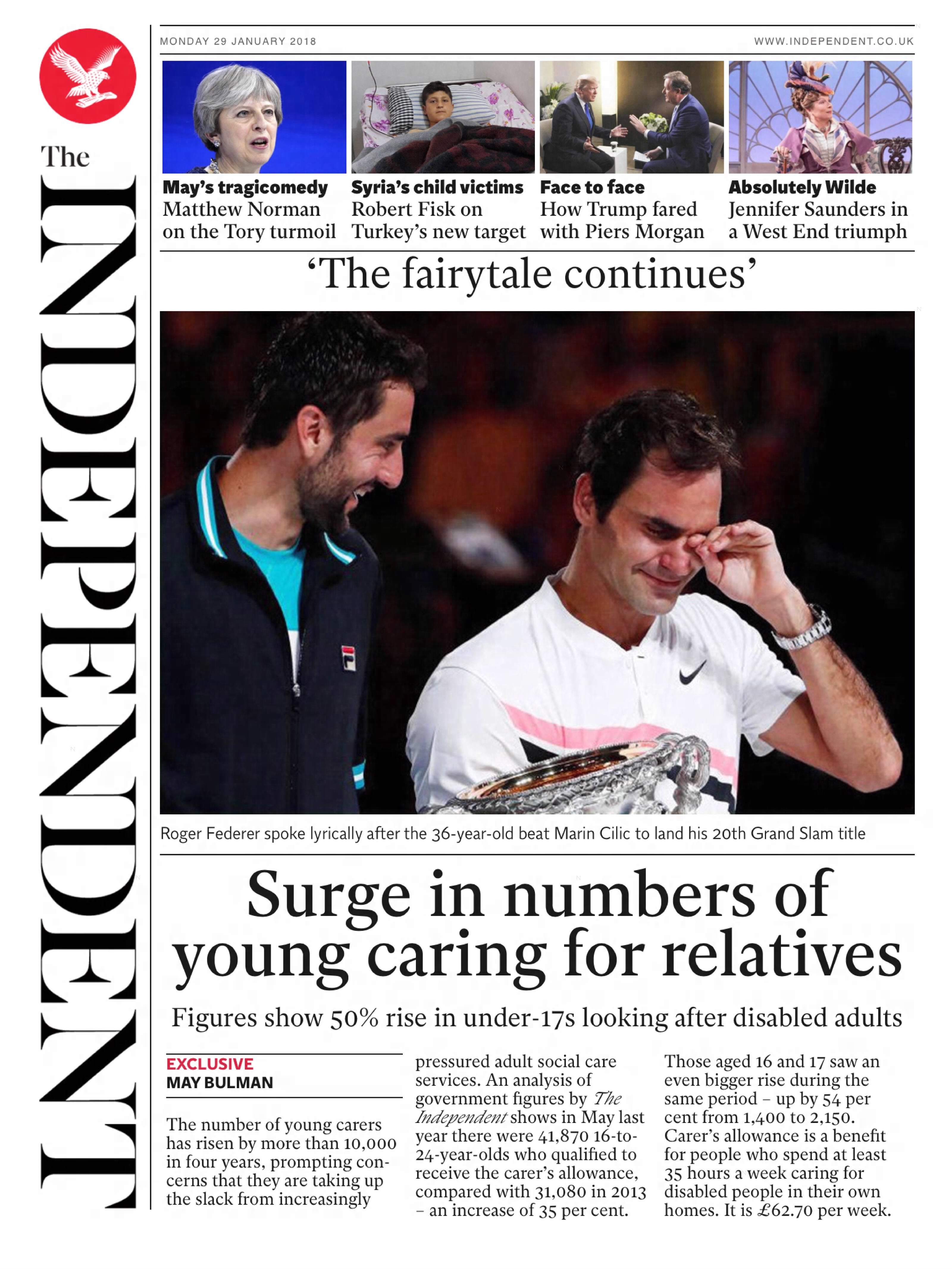 Roger Federer defeats Marin Cilic in a five-set final to claim his 20th grand slam title at the Australian Open, extending a remarkable late-career resurgence at the age of 36. The Independent hails the “fairytale” victory, as Federer becomes the first man to reach 20 men’s singles grand slam titles, adding another milestone to a career many believed had already reached its peak.