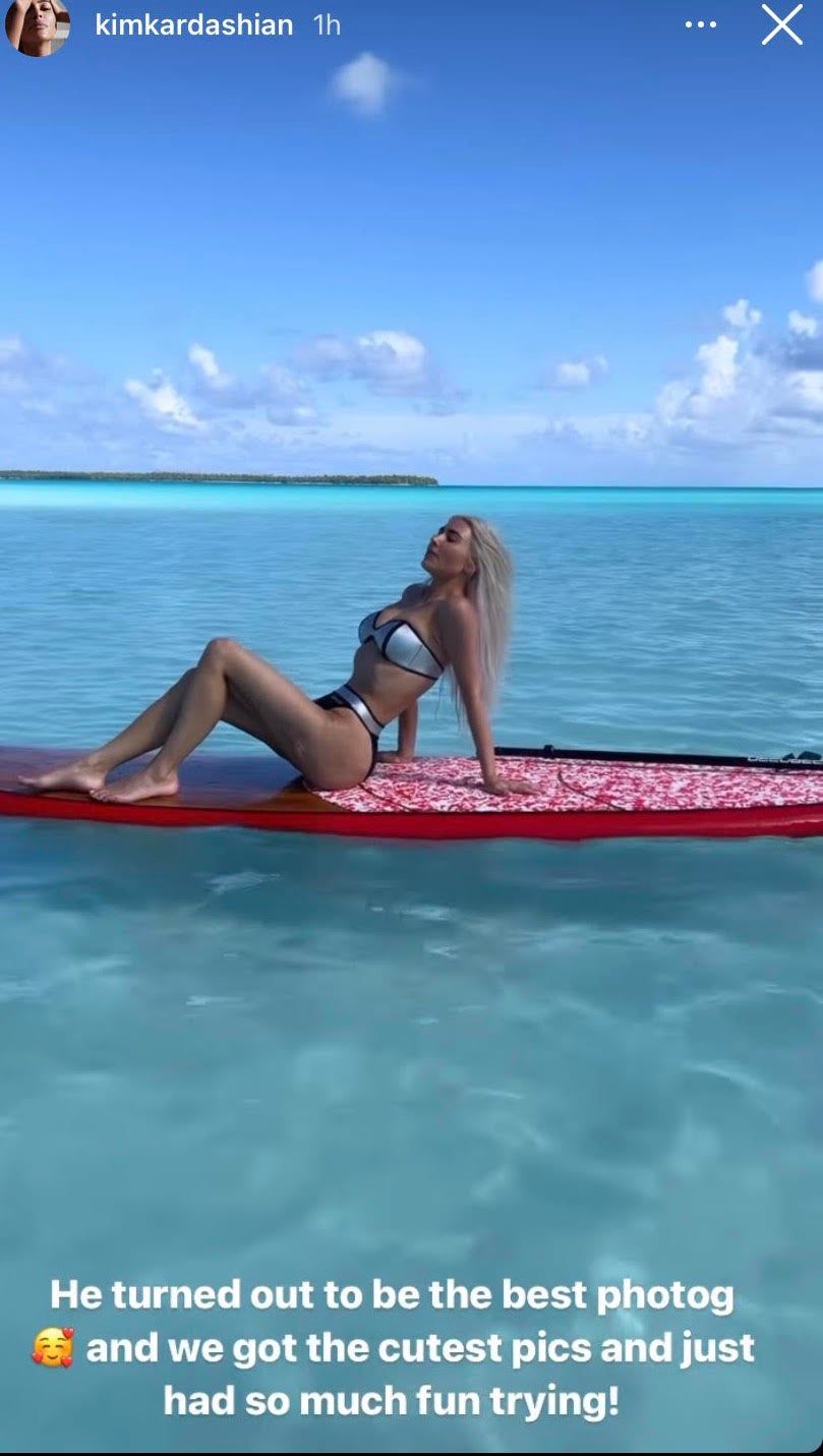 Her story continues with a video of her paddling through the water and saying “hi” to Davidson, as he could be heard laughing in the background. Kardashian then confirmed that Davidson was “making fun of [her]”.