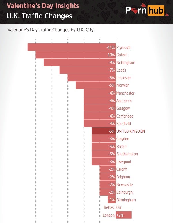 Pornhub saw a (slight) drop in traffic on Valentine's Day as people focused on pleasuring their partners rather than themselves. Everywhere, it is, except for London.
