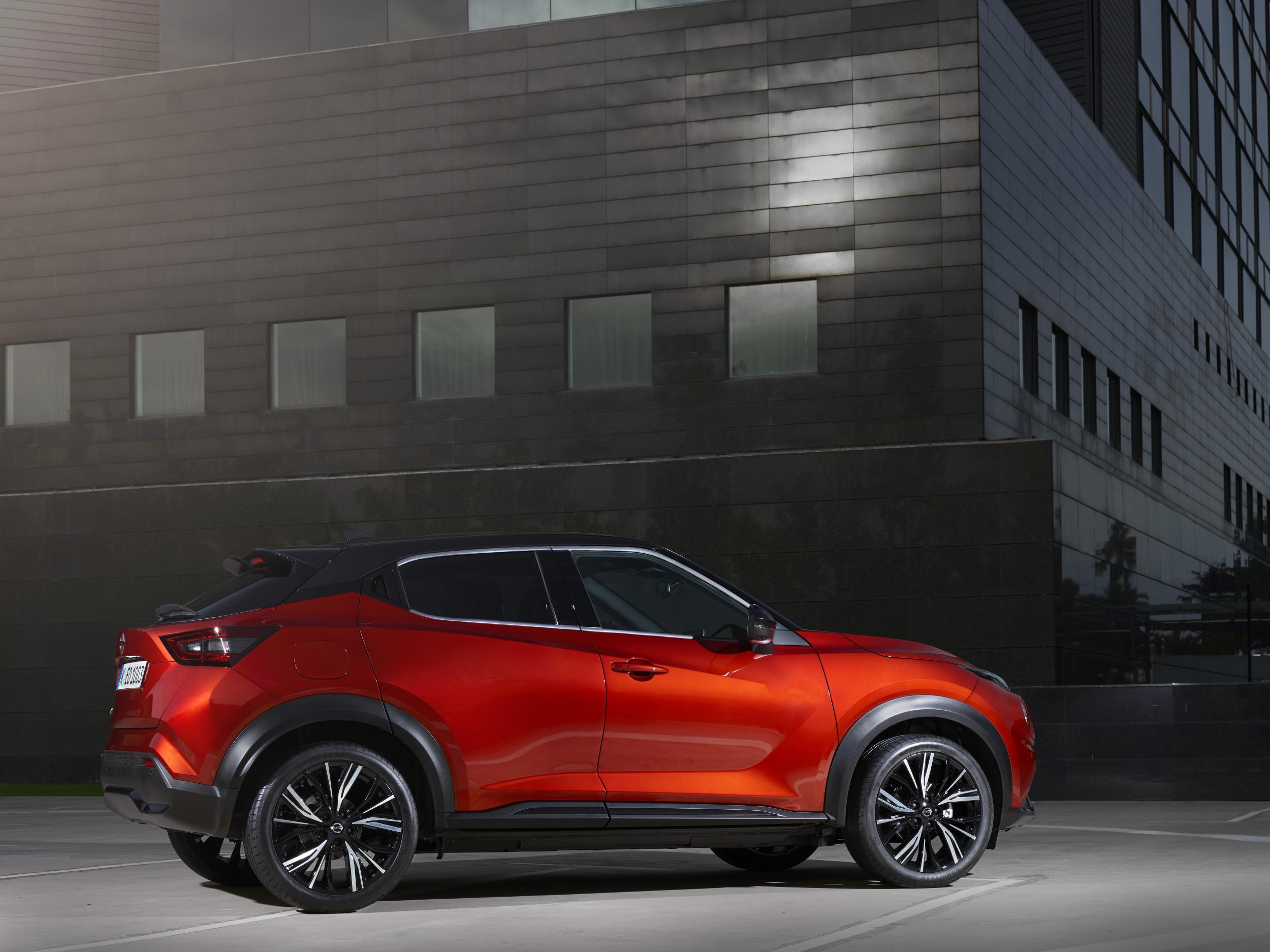Again, the concept of a very highly styled yet practical car has been maintained. The mix of creases and curves on the doors is a remarkable achievement, as pressing steel panels into such a complex mixture of shapes is no mean feat. The rear light cluster now juts out more dramatically, as in the current Micra and Leaf, and the shape of the boot gives the Juke a sort of bobcat appearance. The massive, optional, 19-inch alloy wheels add to the distinctive effect.