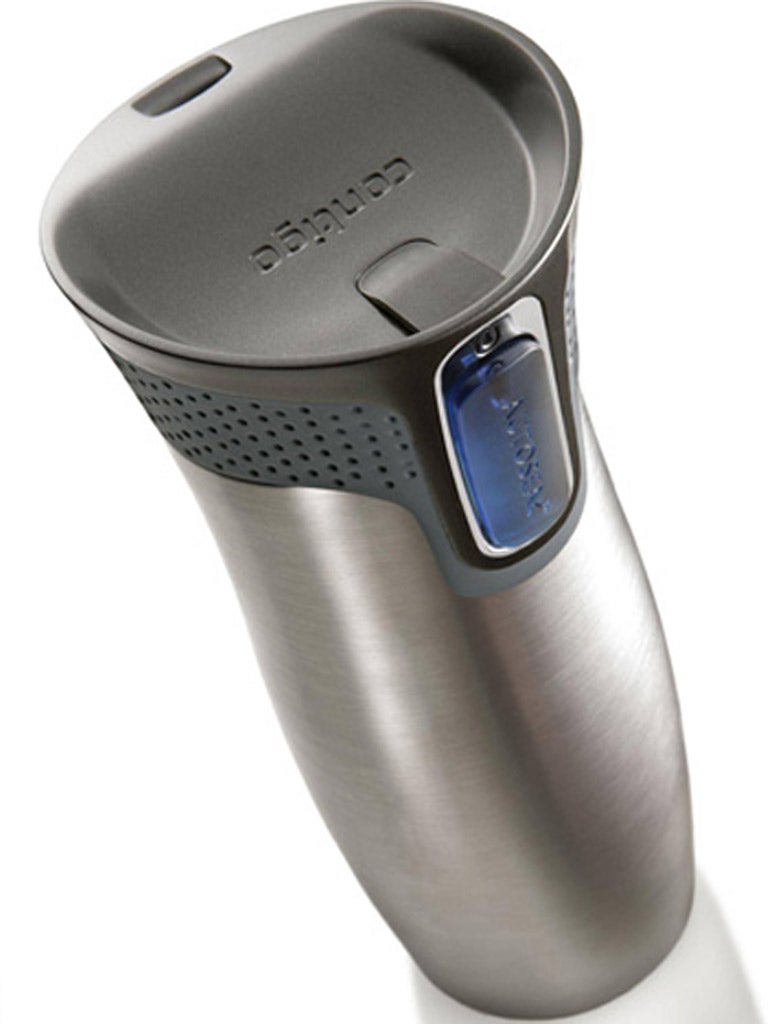 This uses a push'n'sip lid system – press down to sip and release to reseal. It acts as a vacuum flask, too.