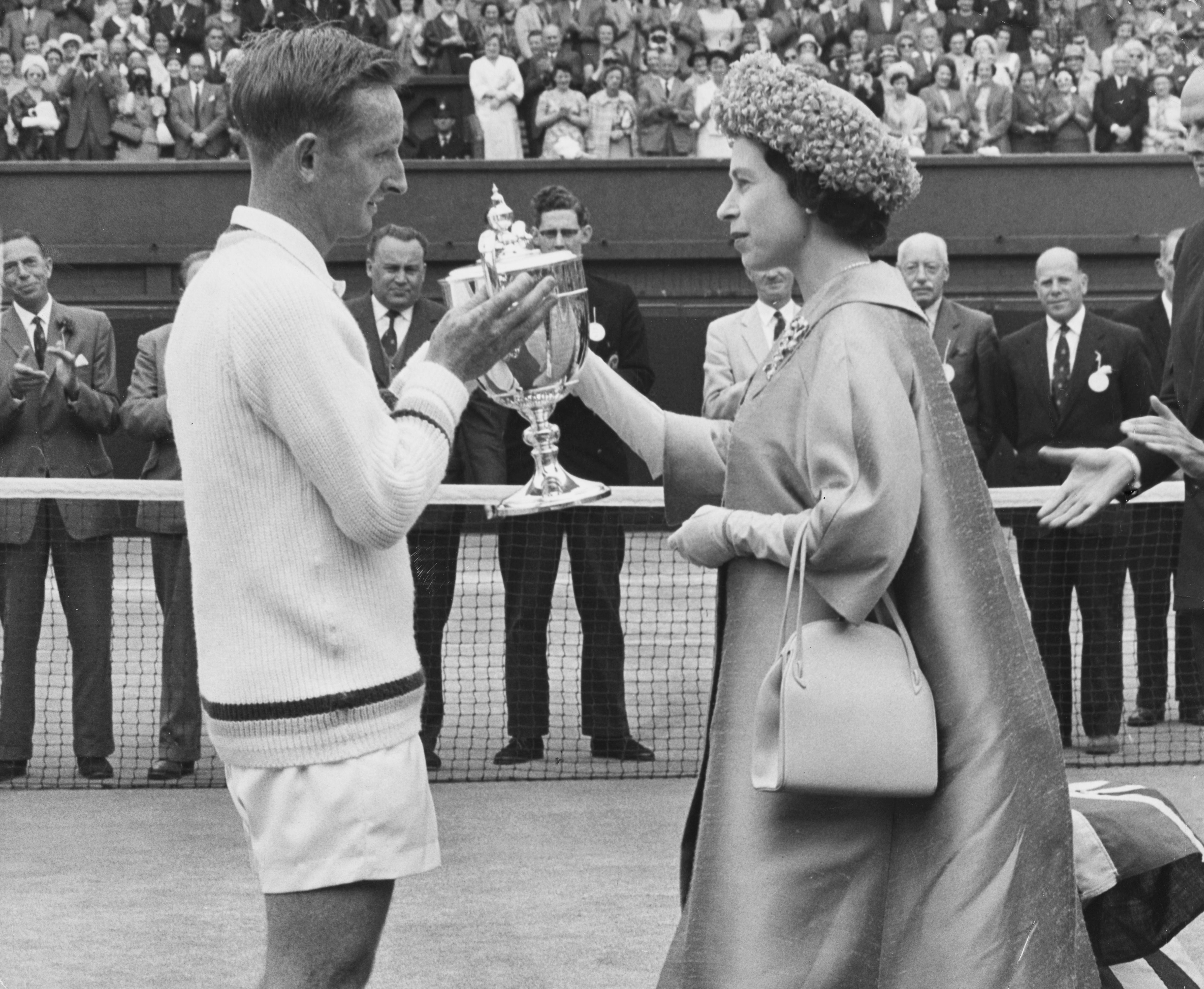 In a flowing cape and textured hat, the Queen presented the gentlemen’s singles trophy to Australian Rod Laver in 1962.
