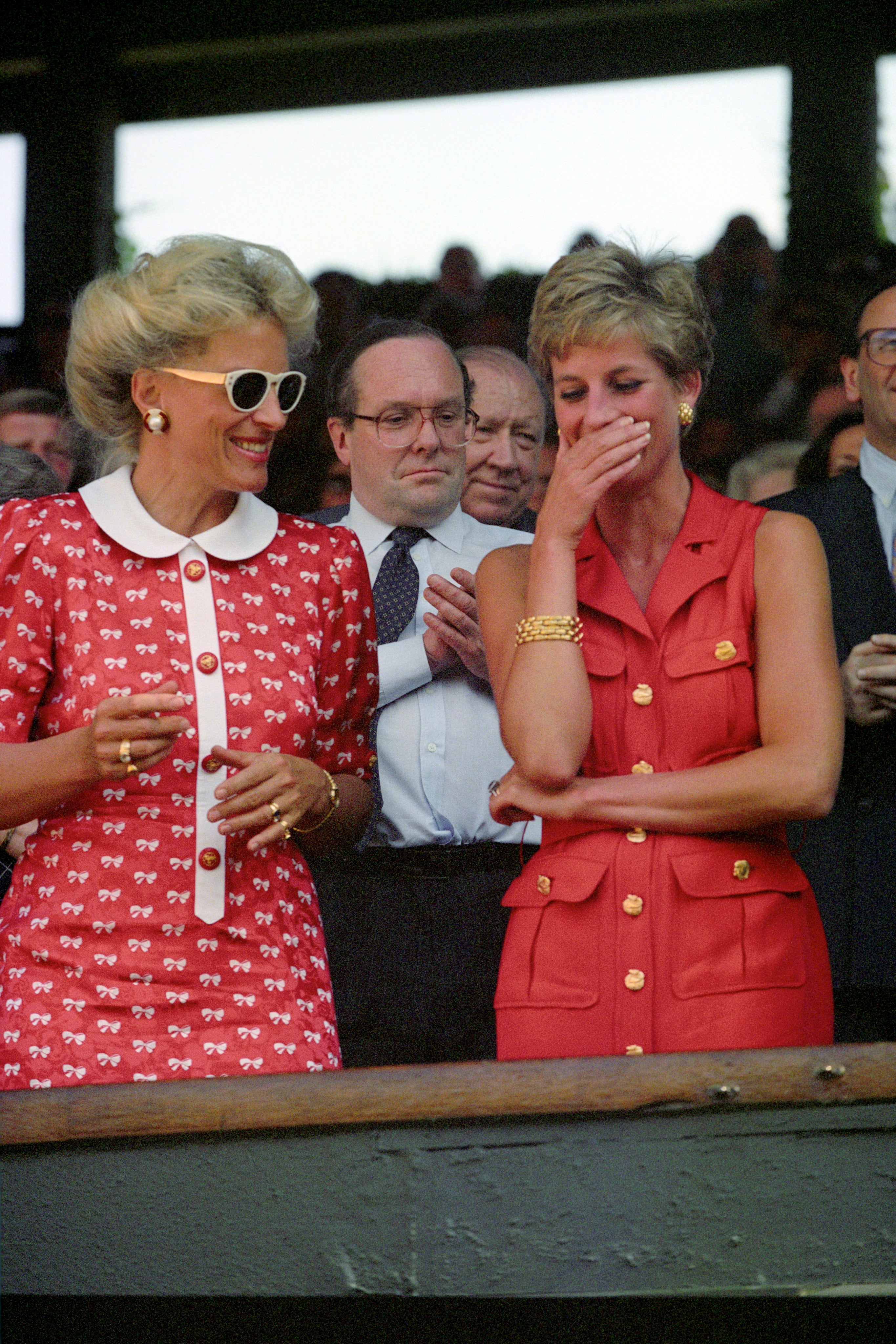 Diana shared a laugh with Princess Michael of Kent during the 1994 men’s singles final. Proving her style is eternal, she wore a red suit dress with gold detailing and complemented it with gold jewellery.