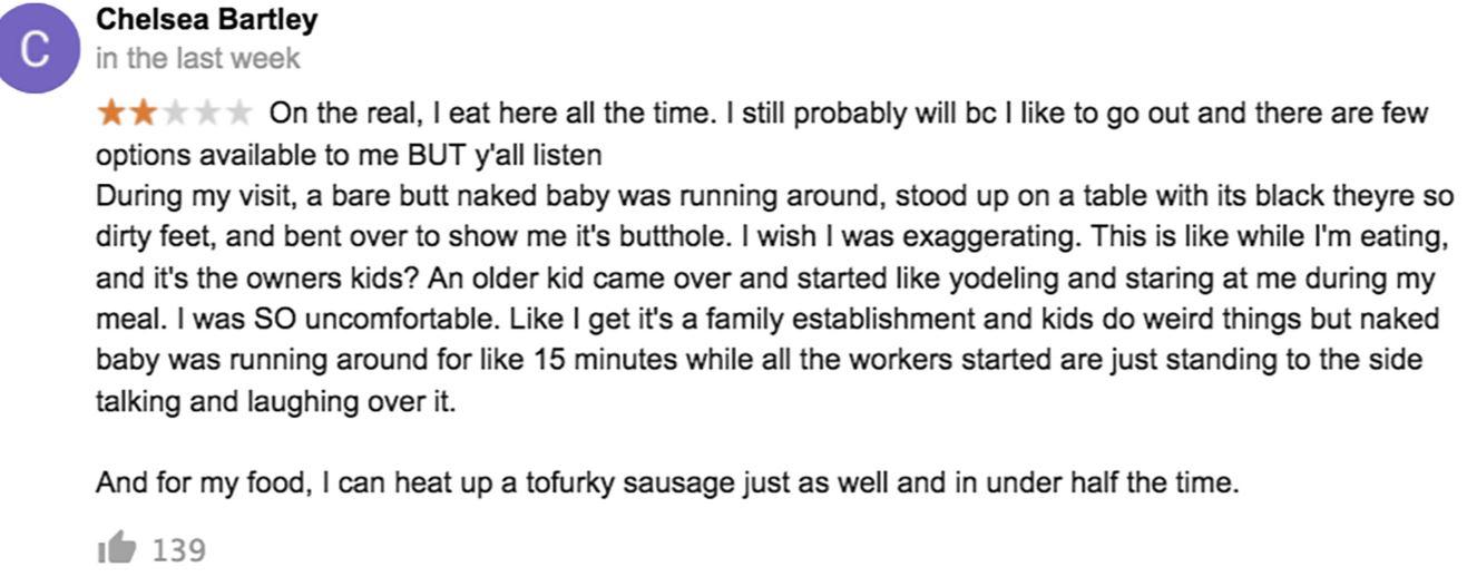 Chelsea Bartley left a two-star Google review of the café after seeing the owners' naked child during her meal.