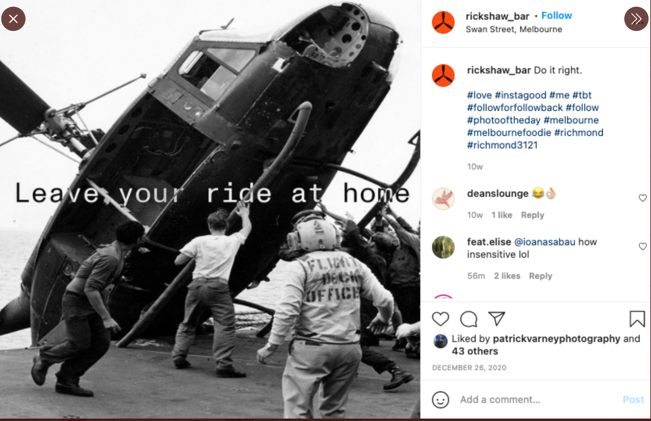In a series of online posts, which have since been removed, the Rickshaw Bar in Richmond, Melbourne, used imagery relating to the Vietnam War, including pint glasses full of bullets, fallen military aircraft, dog tags and references to Agent Orange – a chemical weapon used by the US against the Vietnamese during the war.