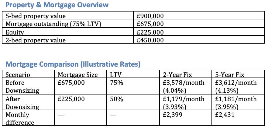 He says moving from a four- or five-bed home into something smaller doesn’t just reduce the price of the new property, it drops you into a lower loan-to-value band, where today’s mortgage rates are lower.