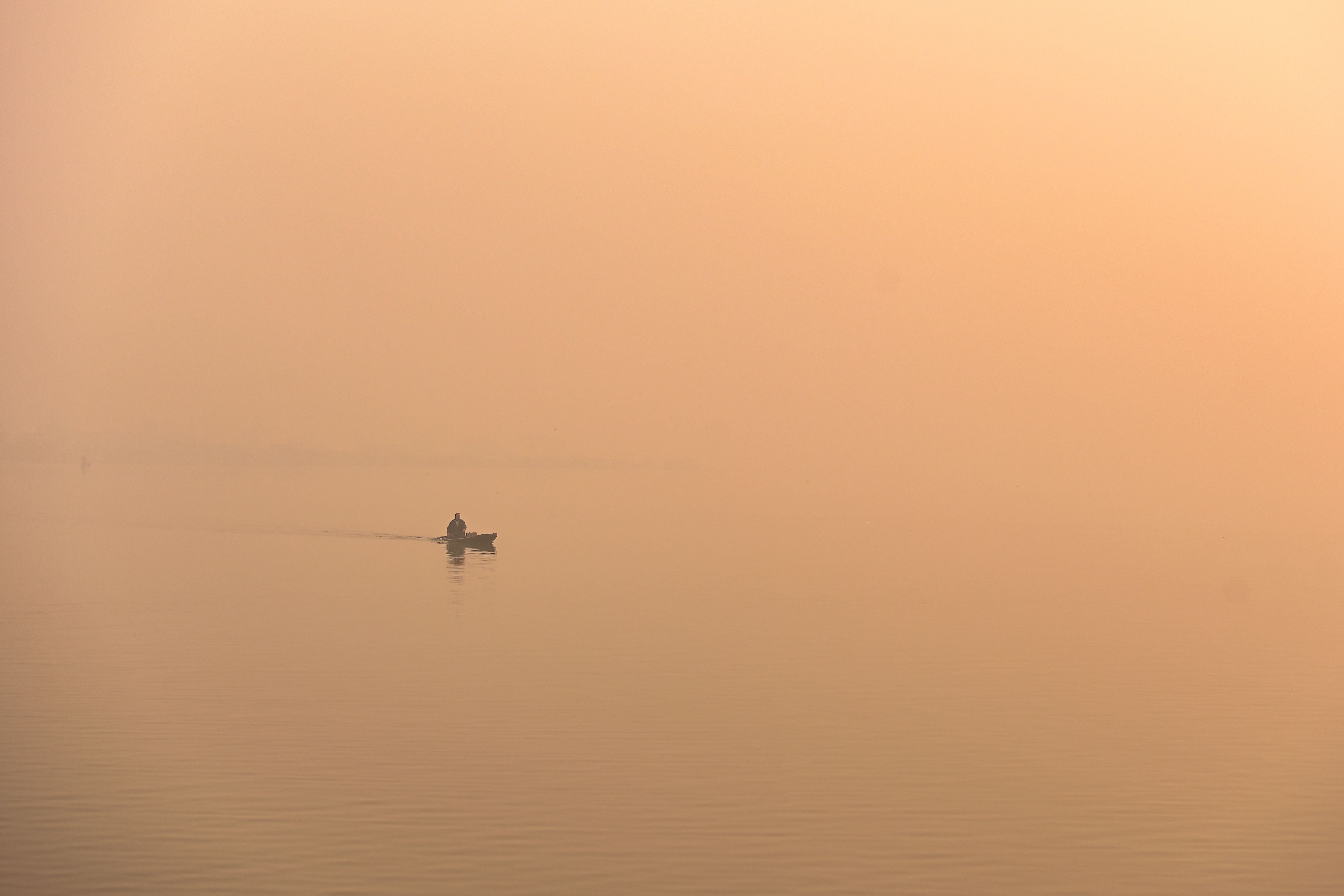 A man steers a boat in Dal Lake amid fog in Srinagar.