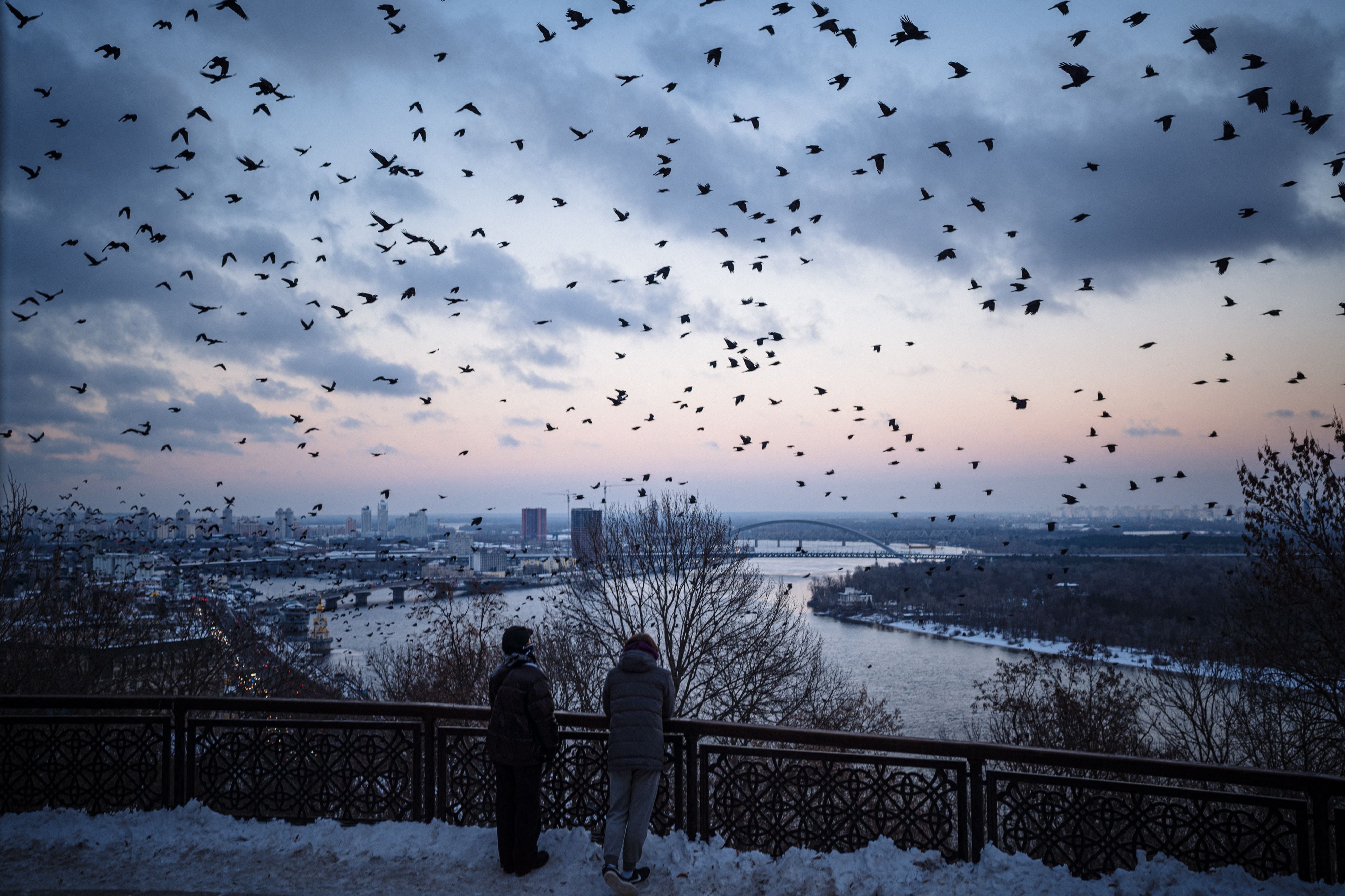 A flock of crows flies over downtown Kyiv amid the Russian invasion of Ukraine. With temperatures dipping below zero, repeated Russian attacks have left Ukraine's energy grid teetering on the brink of collapse and have disrupted power and water supplies to millions over recent weeks.
