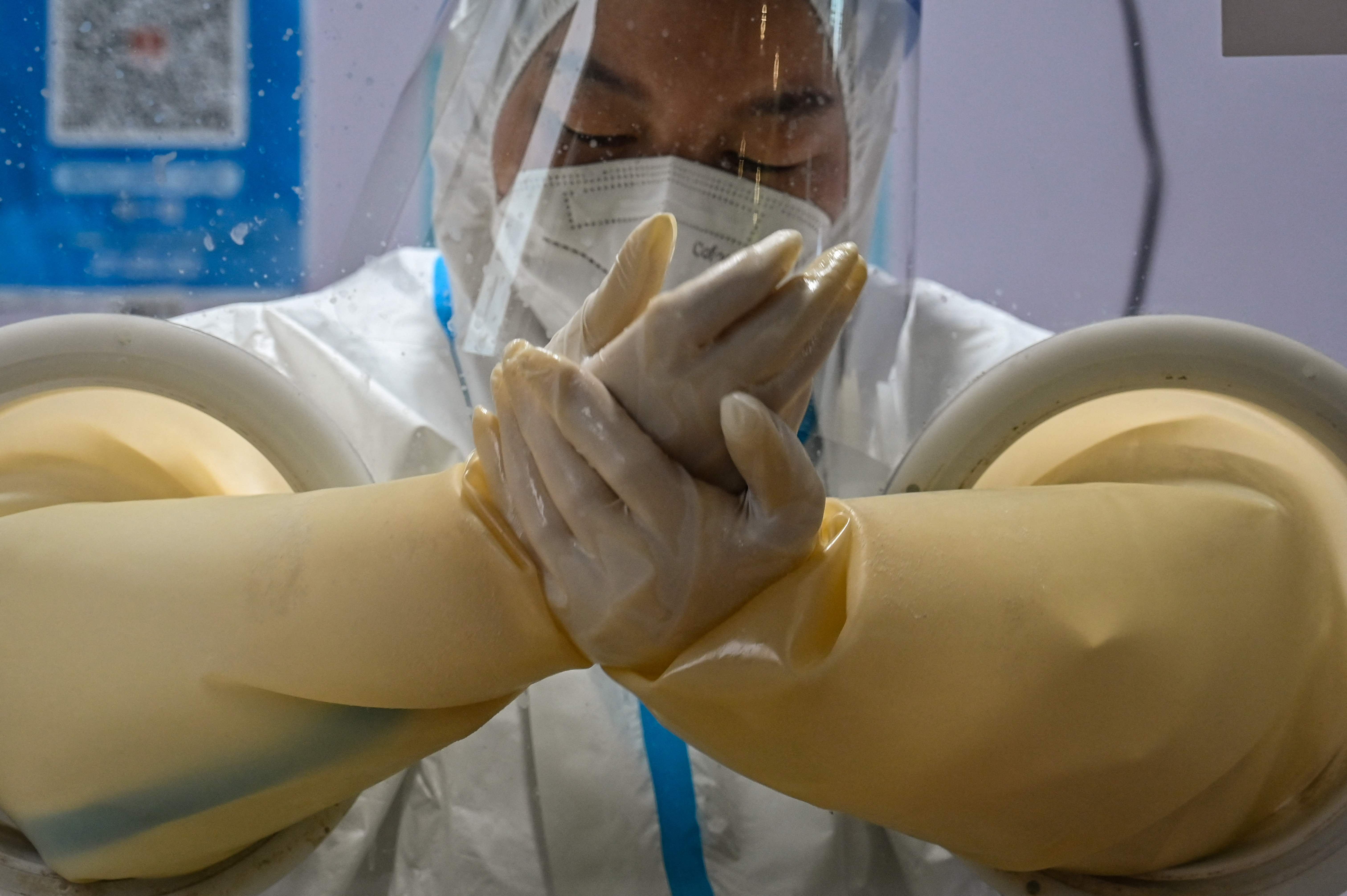 A health worker prepares to take a swab sample from a person to test for the Covid-19 coronavirus in the Jing'an district in Shanghai.