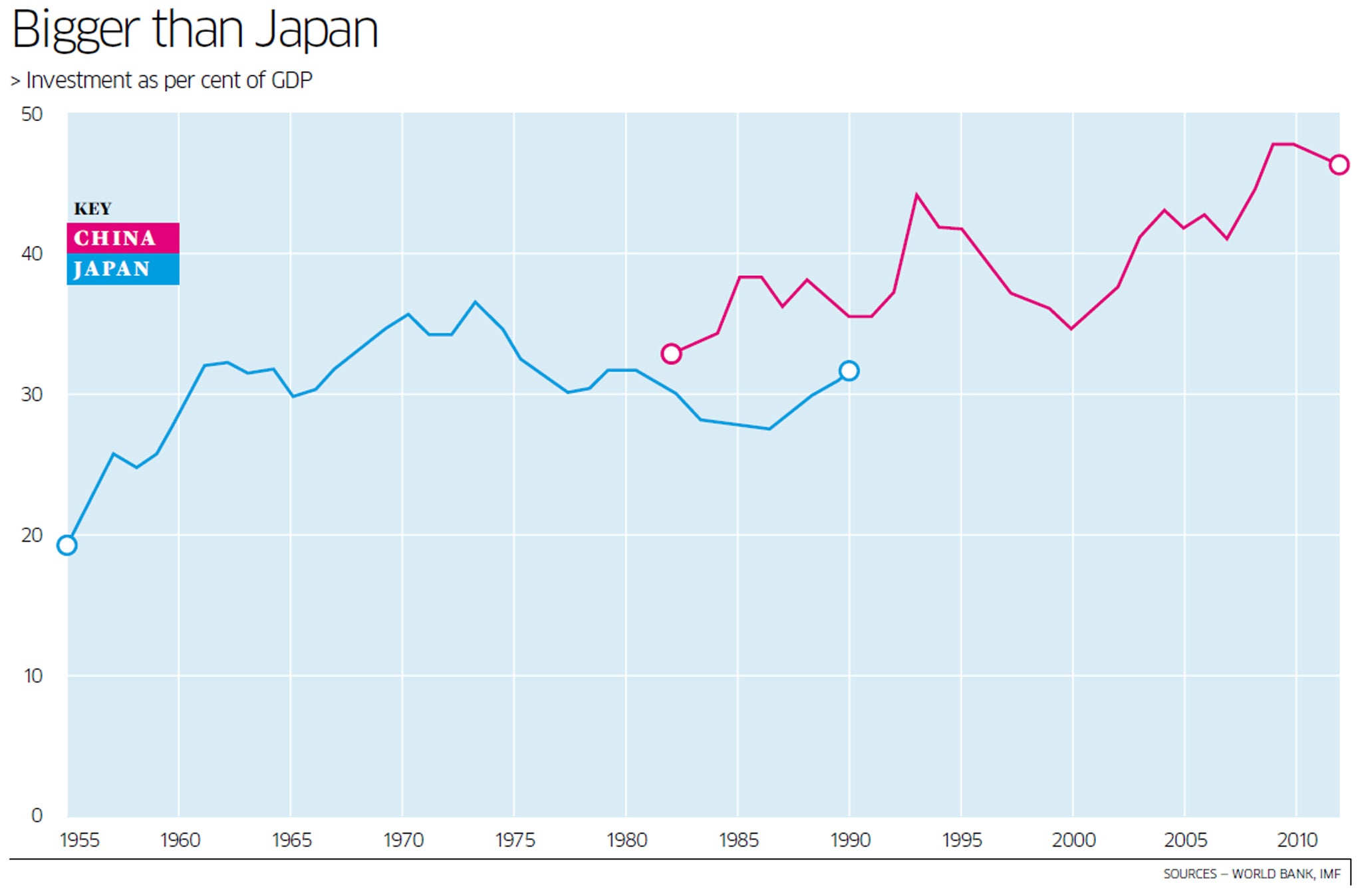 The authors argue that Japan's business and government sector invested to excess in its boom, resulting in a misallocation of resources which, ultimately, turned into a significant drag on growth as banks were encumbered by bad loans. But, as the chart above shows, China's gross capital investment levels in recent decades have actually been even higher. While Japan invested up to 36 per cent of its GDP in its fast growth phase, China has lately been investing close to 50 per cent. As the University of California economics professor Barry Eichengreen puts it: "No economy can productively invest such a large share of its national income for any length of time."