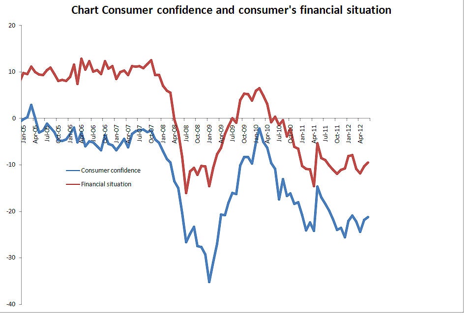 Data releases continue to come in thick and fast confirming that the economy is going nowhere. As is clear from the above chart, consumer confidence as well as respondents' views on their financial situation are showing no sign of recovery. Another poor set of figures on government borrowing in the first two months of the fiscal year showed they were 15 per cent higher than a year ago, reflecting both high spending growth (central government current spending rose by 7.9 per cent year on year) and weak tax receipts growth of 1.6 per cent.