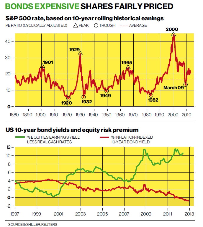 You can see the price-earnings ratio of US shares, going right back to 1880, in the top graph – I am taking American data as it is to hand, but the same lessons would apply to UK or European securities. Back in March 2009 they were indeed very cheap, as some of us wrote at the time. Now they are above their adjusted, 120-year average.