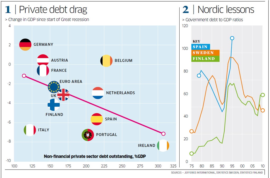 So what happened? There has been some good work on all this by Marchel Alexandrovich and David Owen of Jeffries International. Alexandrovich looks in particular at the lessons that Sweden and Finland have for Spain, concluding that the big difference now is that Spain cannot devalue to increase its competitiveness and reduce the real value of the debt. The surge in public debt that took place in the early 1990s for those two countries is quite similar; the problem is that Spanish debt is still rising whereas that of Sweden and Finland was, at the same stage of the cycle, starting to fall – as you can see from the right-hand graph.