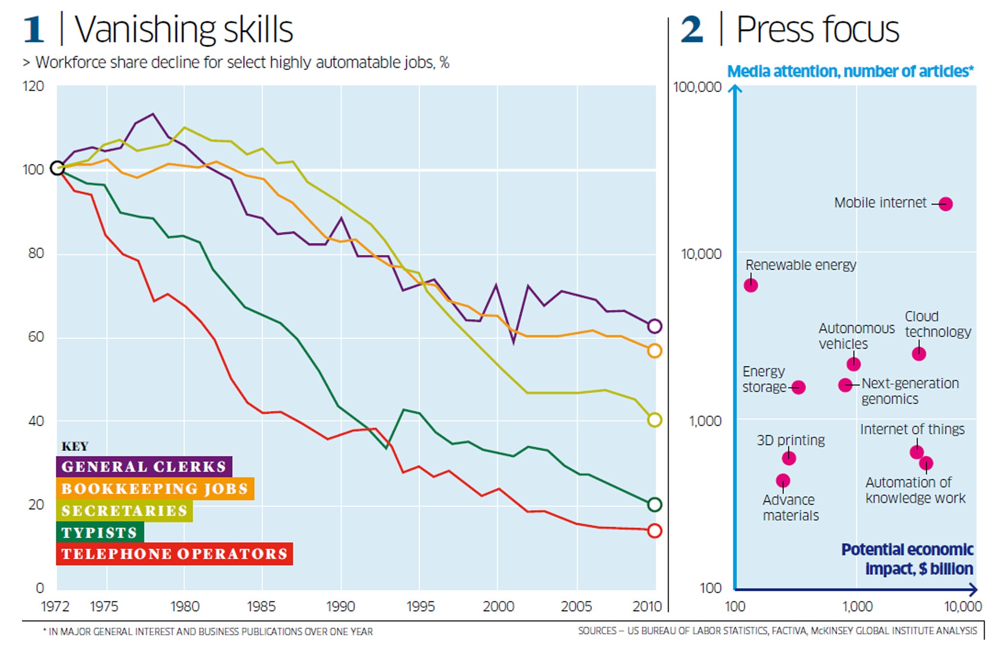 First, a look backwards. The main graph shows how some types of job have over the past 40 years been almost completely automated away. The most extreme examples are typists and telephone operators, for we all do our own typing now and connect our own calls. One of the astounding social changes has been the near-demise of the fixed-line phone as a way of contacting each other – a change that has its downsides as well as upsides. Many such changes are a result of the development of the internet and associated technologies, but note that the decline in both those types of job was well under way by the time that the net took off in the middle 1990s.