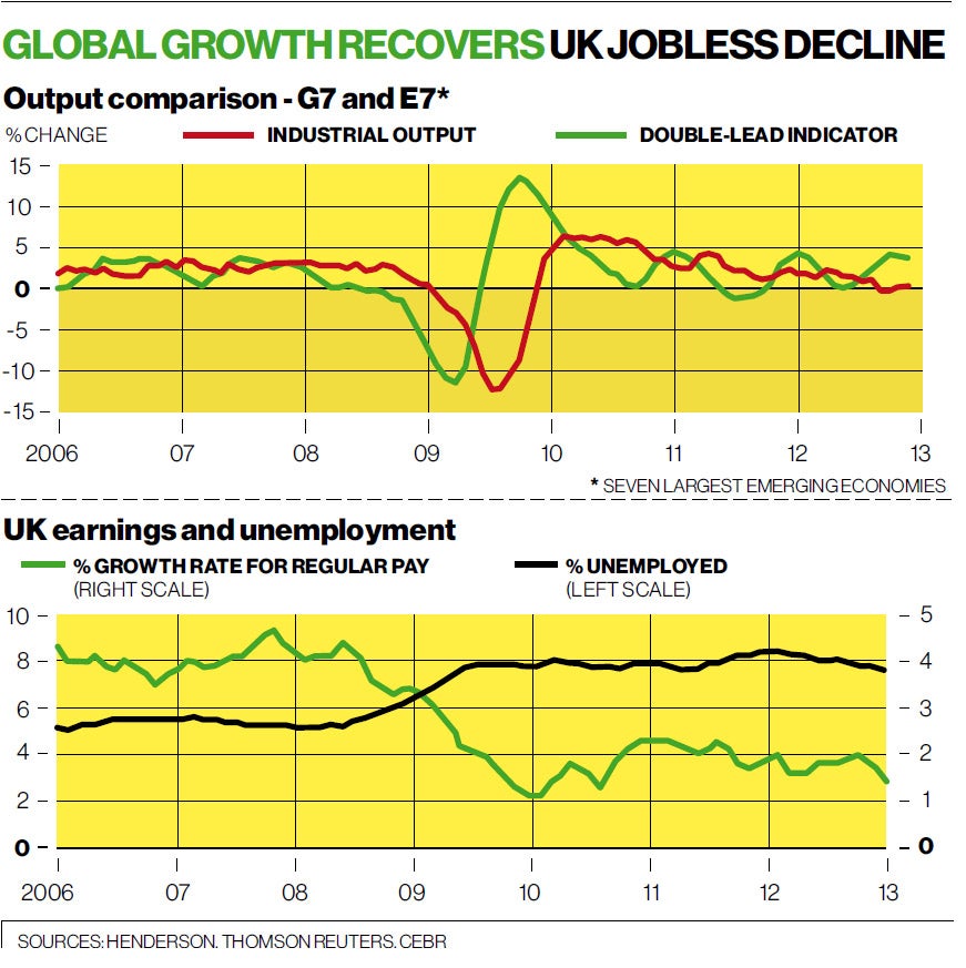 If you think world rather than UK, US or Europe, the calculation of G7 plus E7 output is a useful one. The G7 we know about, the world's seven largest developed economies; the E7 is simply the world's seven largest emerging ones. Put the two together and you are covering more than 80 per cent of global output. Some numbers for what has been happening to industrial production for these two umbrella regions have been put together by Simon Ward at fund managers Henderson, and they are shown in the top graph.